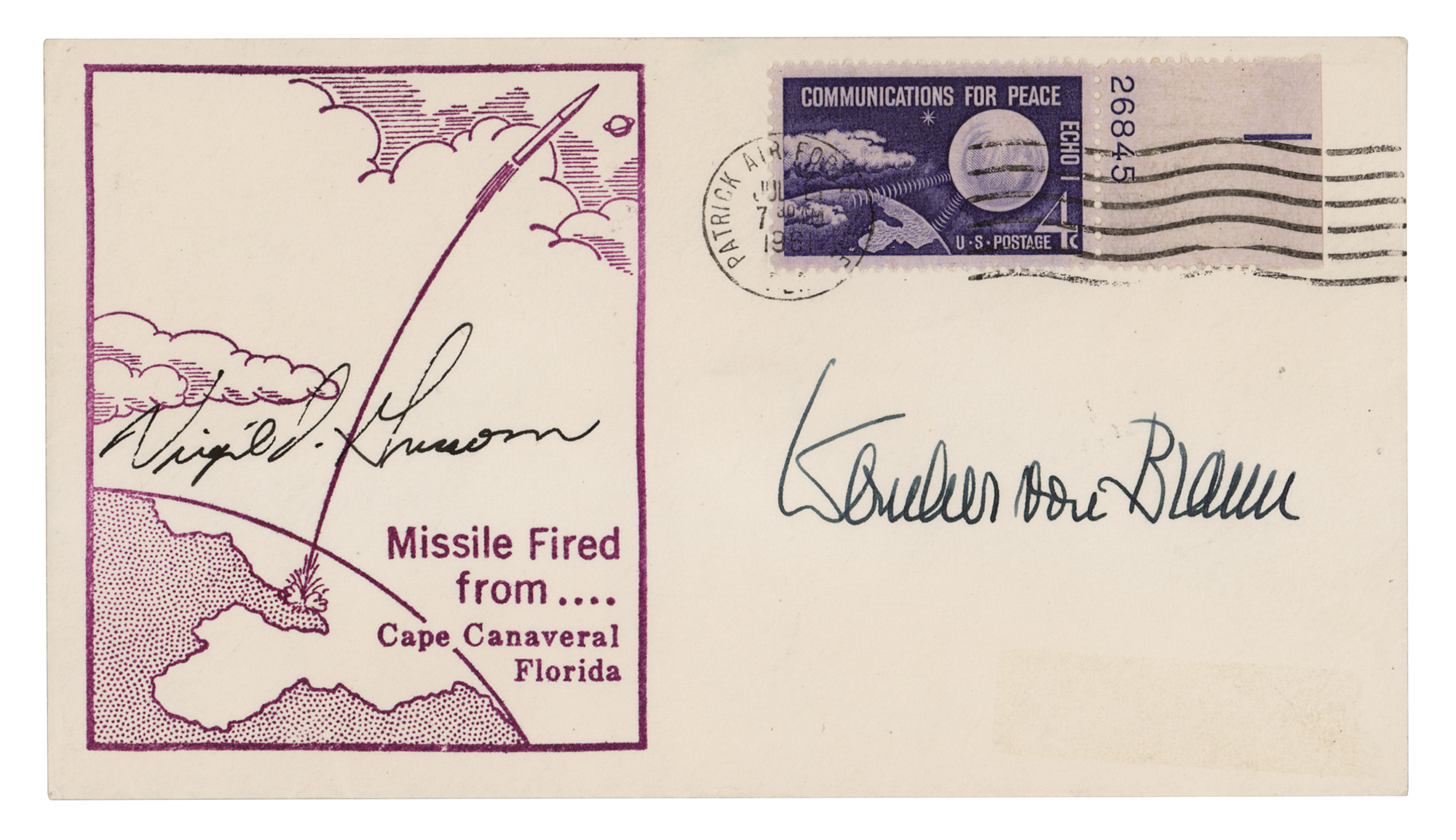Rare cover with a “Missile Fired from…Cape Canaveral, Florida” cachet, postmarked on July 21, 1961, the date of the Mercury-Redstone 4 mission, signed in black ink by the Liberty Bell 7 pilot, “Virgil I. Grissom,” and in fountain pen, “Wernher von Braun.” In very fine condition. Accompanied by a full letter of authenticity from Zarelli Space Authentication.