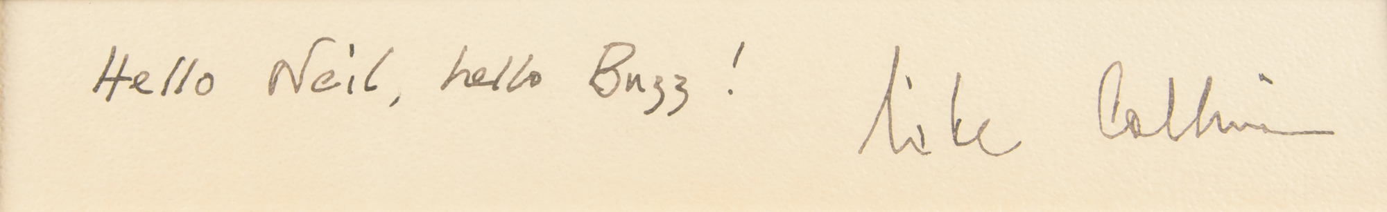 Sought-after ink signature, "Hello Neil, hello Buzz! Mike Collins,” on an off-white 8 x 1.25 cardstock sheet, which is matted below a large color photo of the Apollo 11 Lunar Module Eagle ascending from the moon towards the Command Module Columbia during rendezvous. Framed to an overall size of 20.5 x 19. The reference 'cardstock sheet' is ostensibly the photograph's original presentation mat. In very fine condition. A great autograph enhanced by its accompanying image, which is made all the more significant by the fact that the photographer, CMP Collins, was the only human—alive or dead—not in the frame of this picture.