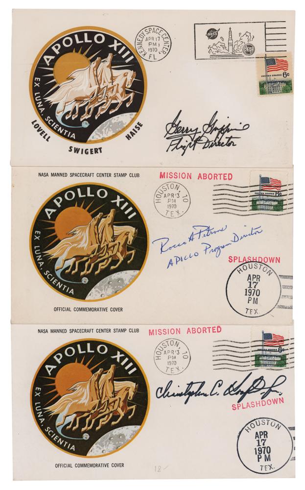 Three commemorative covers with color cachets honoring the Apollo 13 mission, all postmarked on April 17, 1970, the date of mission ‘splashdown,’ individually signed in ballpoint or felt tip by a noted NASA director: “Christpher C. Kraft, Jr.,” “Gerry Griffin, Flight Director,” and “Rocco A. Petrone, Apollo Program Director.” Two covers are stamped “Mission Aborted, Splashdown.” In overall very fine condition. Accompanied by a full letters of authenticity from Zarelli Space Authentication for all three.