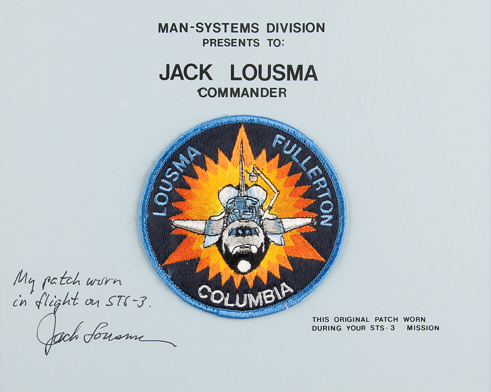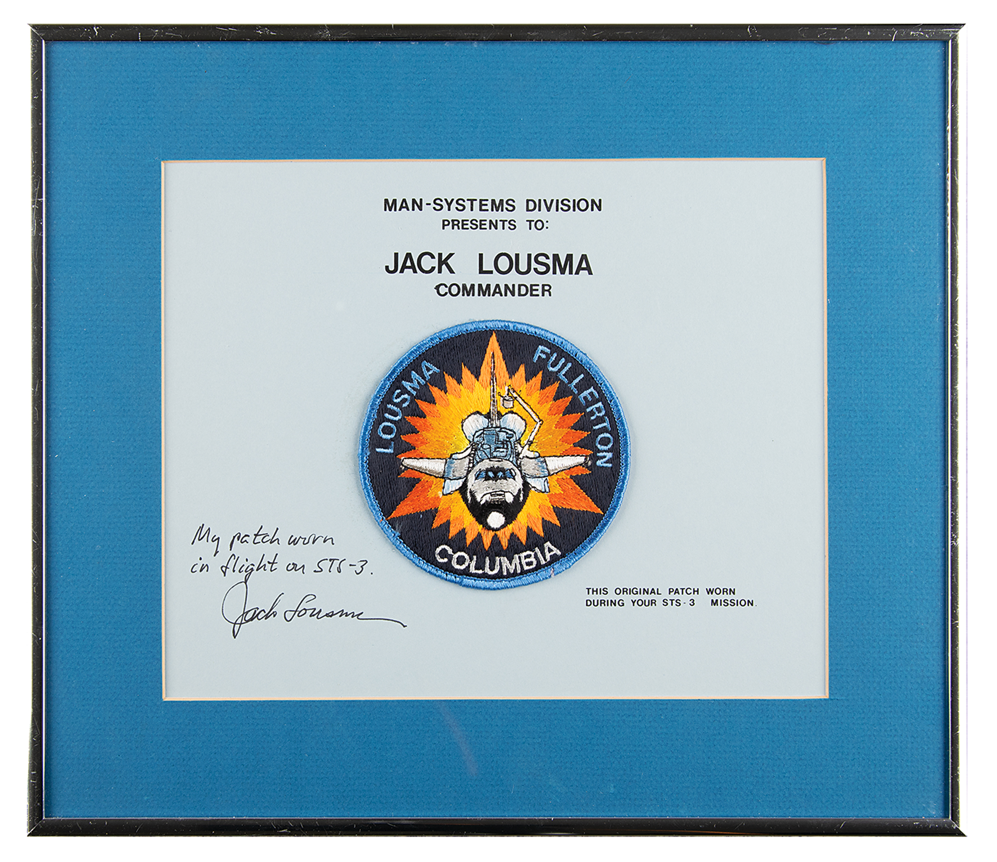 Jack Lousma's flown embroidered STS-3 crew patch, measuring 4″ in diameter, affixed to a light blue 10 x 8 presentation sheet signed and flight-certified in black felt tip, "My patch worn in flight on STS-3. Jack Lousma." The sheet reads, in full: "Man-Systems Division presents to: Jack Lousma, Commander, This original patch worn during your STS-3 mission." Matted and framed to an overall size of 14.25 x 12.25. In fine condition. Sewn to the shirt of the mission commander, this patch spent eight days aboard the Space Shuttle Columbia during its 130 Earth orbits. Given its distinction as having been worn during space flight and not relegated to stowage, this is an immensely appealing and uncommon example of a flown mission patch.