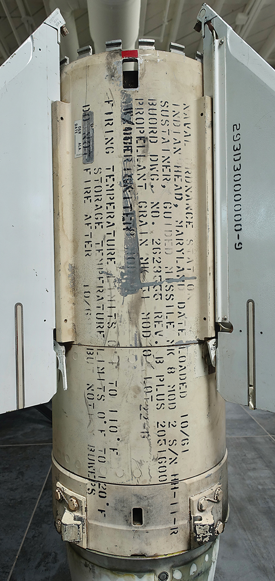 Bullpup missile fin can and tail, marked on the side: "Naval Ordnance Station, Indian Head, Maryland, Date Loaded 10/61, Sustainer, Guided Missile MK 8 Mod 2 S/N HH-11-R, Buord Dwg. No. 63555 Rev. B Plus 051600."