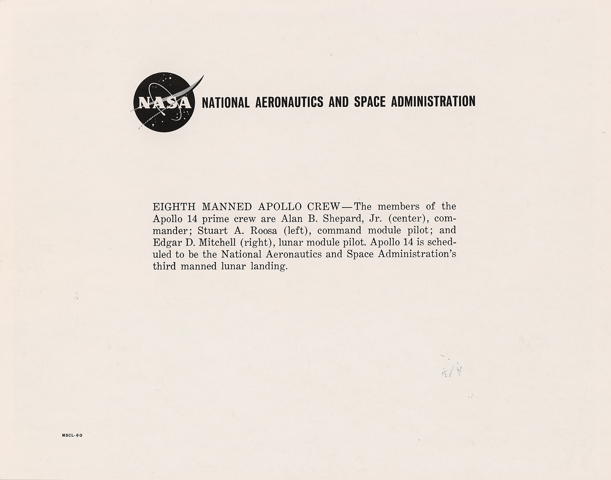 Official color 10 x 8 NASA lithograph of the Apollo 14 crew posing in their white space suits against an outer space and mission insignia background, signed in black felt tip, "Al Shepard," "Ed Mitchell," and "Stu A. Roosa." In very fine condition.