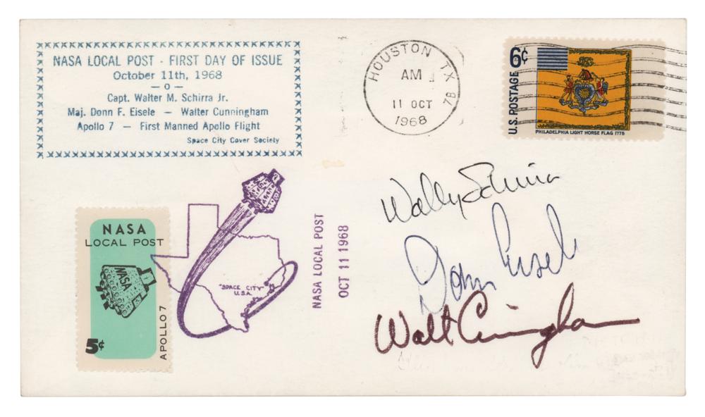 Scarce NASA Local Post FDC with stamps and postmarks honoring the launch of the Apollo 7 mission on October 11, 1968, signed in black ballpoint by Wally Schirra and Donn Eisele, and in black felt tip by Walt Cunnigham. In very fine condition.