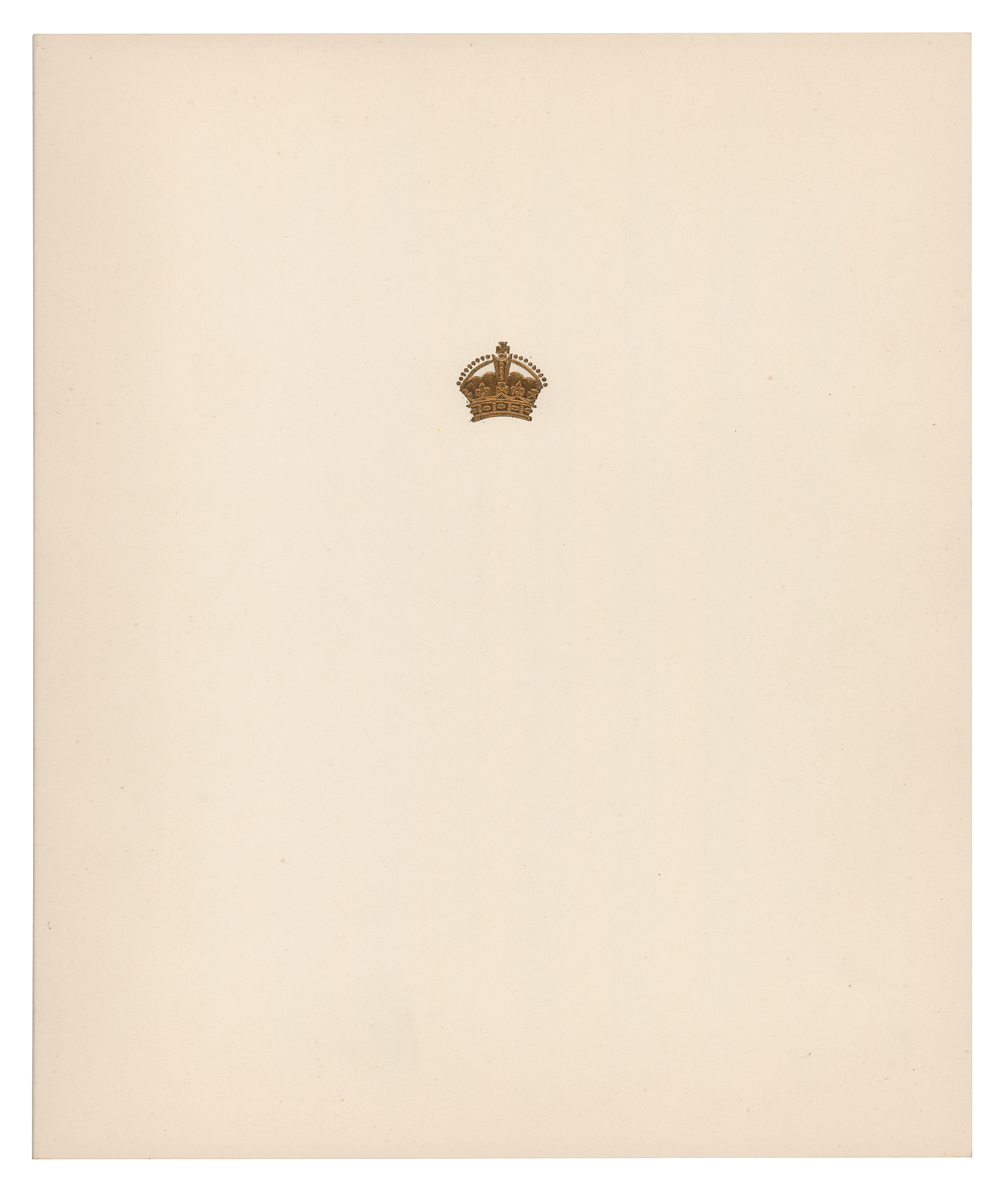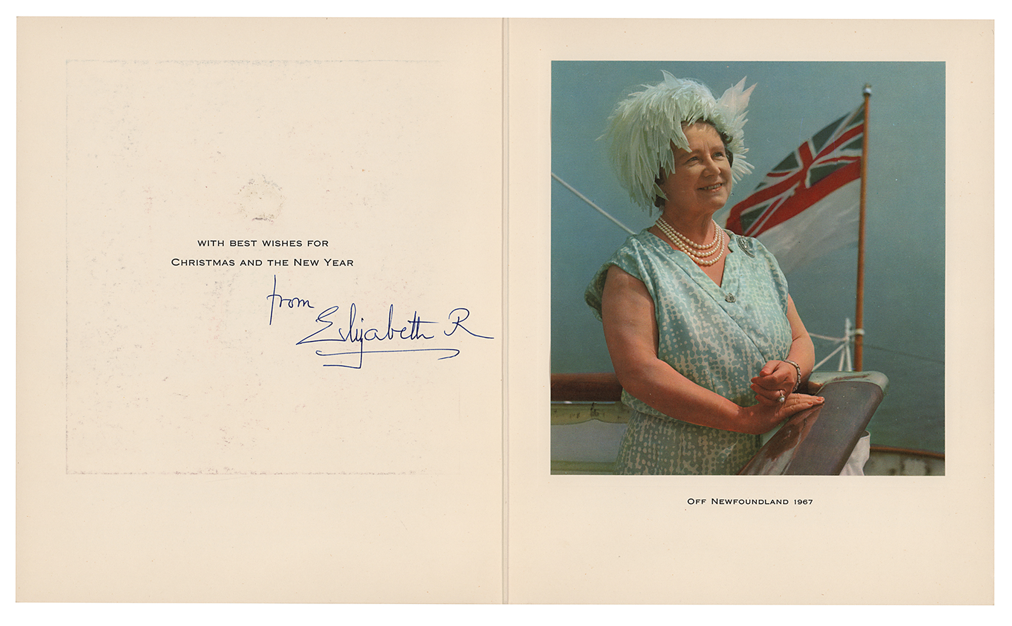 Desirable Royal Christmas card from 1967 with an embossed crown on the front, measuring 15.5 x 9.25 open, with the inside bearing an affixed image of the Queen Mother posing on a ship’s reeling off Newfoundland, signed on the adjacent page in blue ballpoint, "from, Elizabeth R." In very fine condition.