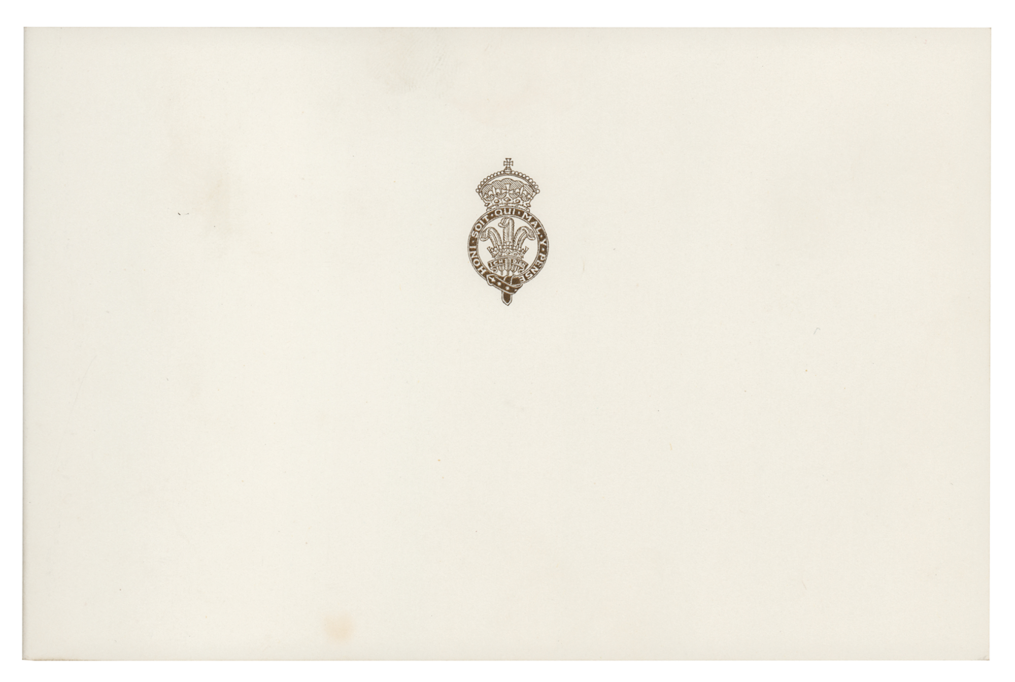 Christmas card from 1979 with the front bearing an embossed coat of arms, measuring 14.5 x 4.75 open, featuring an affixed color photo inside of Prince Charles and the Queen Mother in an open-top buggy, signed and inscribed on the left side in fountain pen, "Mr. and Mrs. Darby, from Charles." In very fine condition.