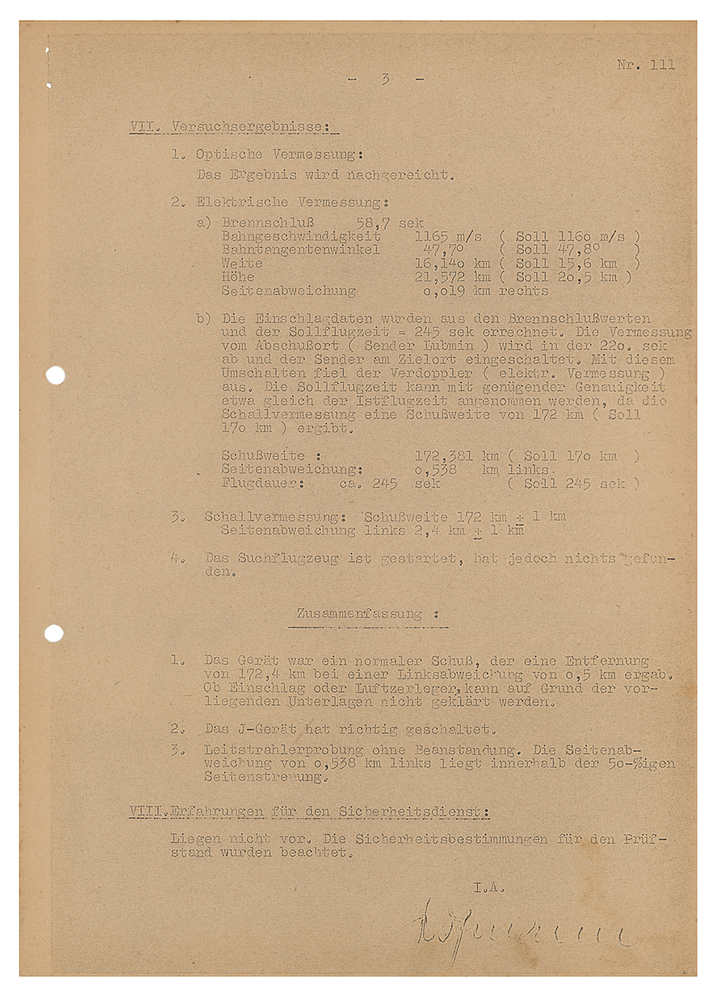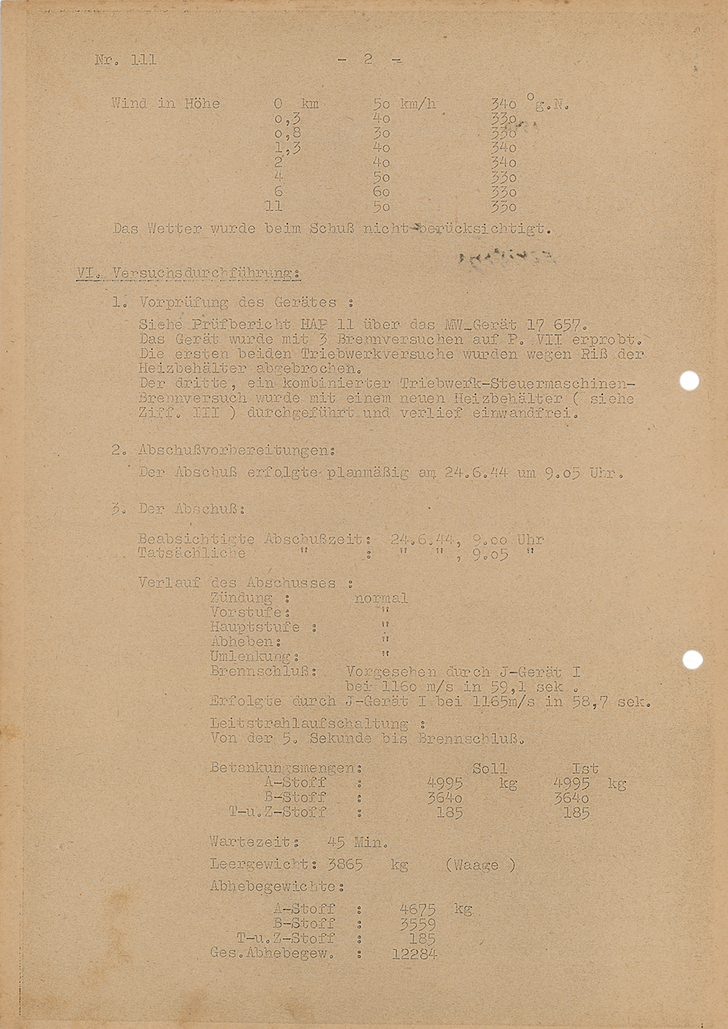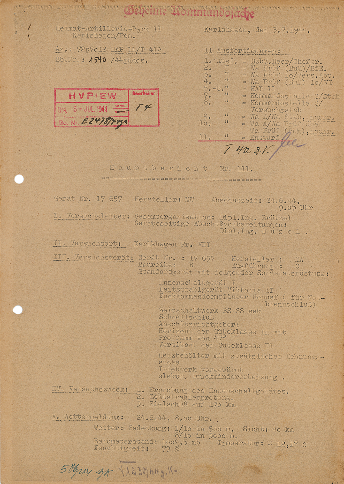 Original copy of a German document, three pages on two sheets, 8.25 x 11.75, July 3, 1944. Launch report of a German V-2 (A4) rocket, stamped as top secret ("Geheime Kommandosache"), issued at Heimat Artillerie Park 11 at the Peenemünde Army Research Center. The report offers details of the rocket and launch: "Machine nr. 17657, Constructor MW [Mittelwerke], Launch date and time: 24.6.1944, 9.05AM, Responsible people/engineers : Brützel and Huzel. Launch site: Karlshagen, launch site VII." This is followed by the test goal ("Test of an inner circuit, guidance beam, target shot at 170km distance"), weather report, and technical data. Most interesting is the result of the test flight: the rocket crashed after traveling 172km, only 538 meters off-target. In fine condition, with uniform toning.