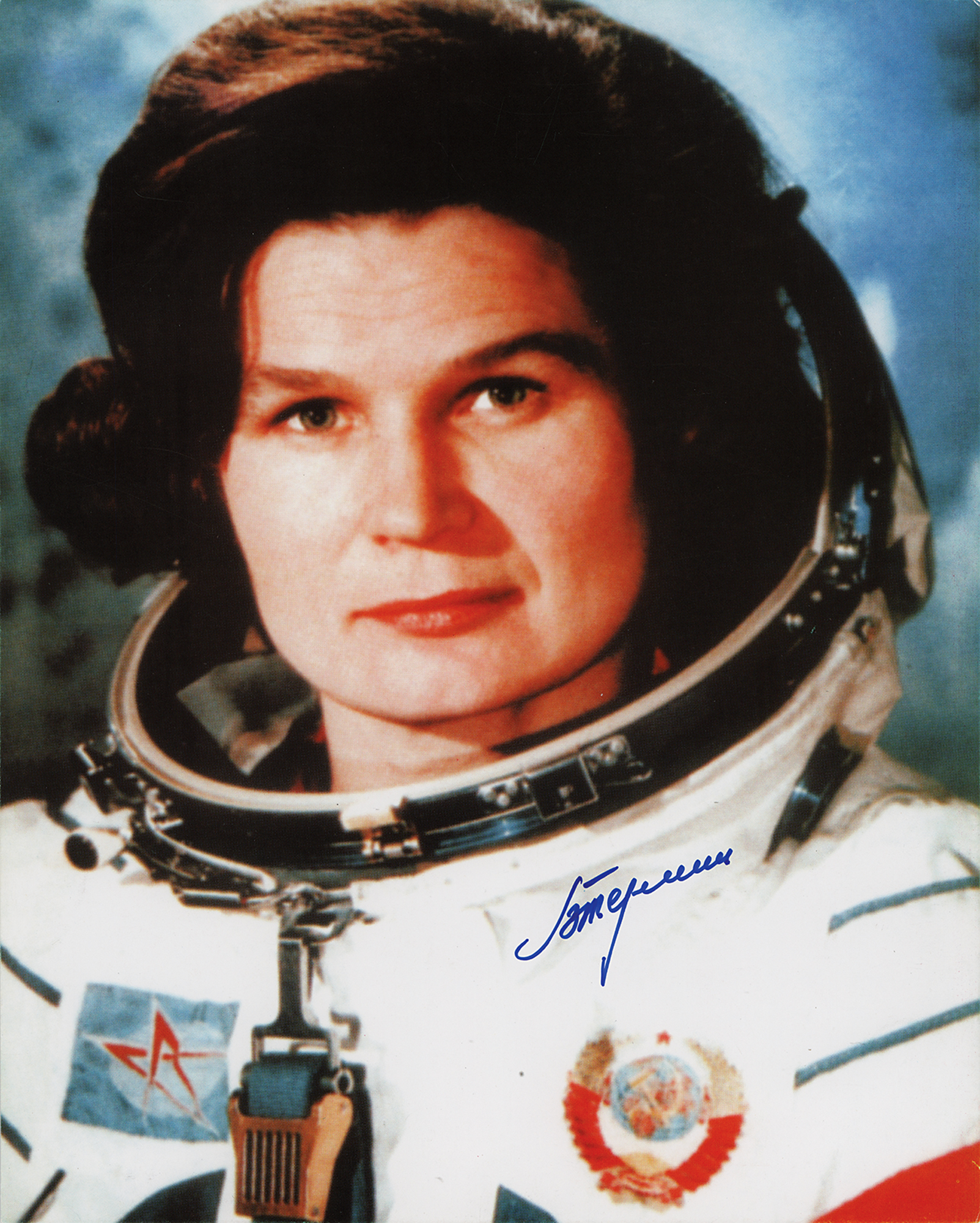 Color 8 x 10 cardstock photo of the first woman in space in a close-up pose, signed in blue felt tip by Valentina Tereshkova. In fine condition.