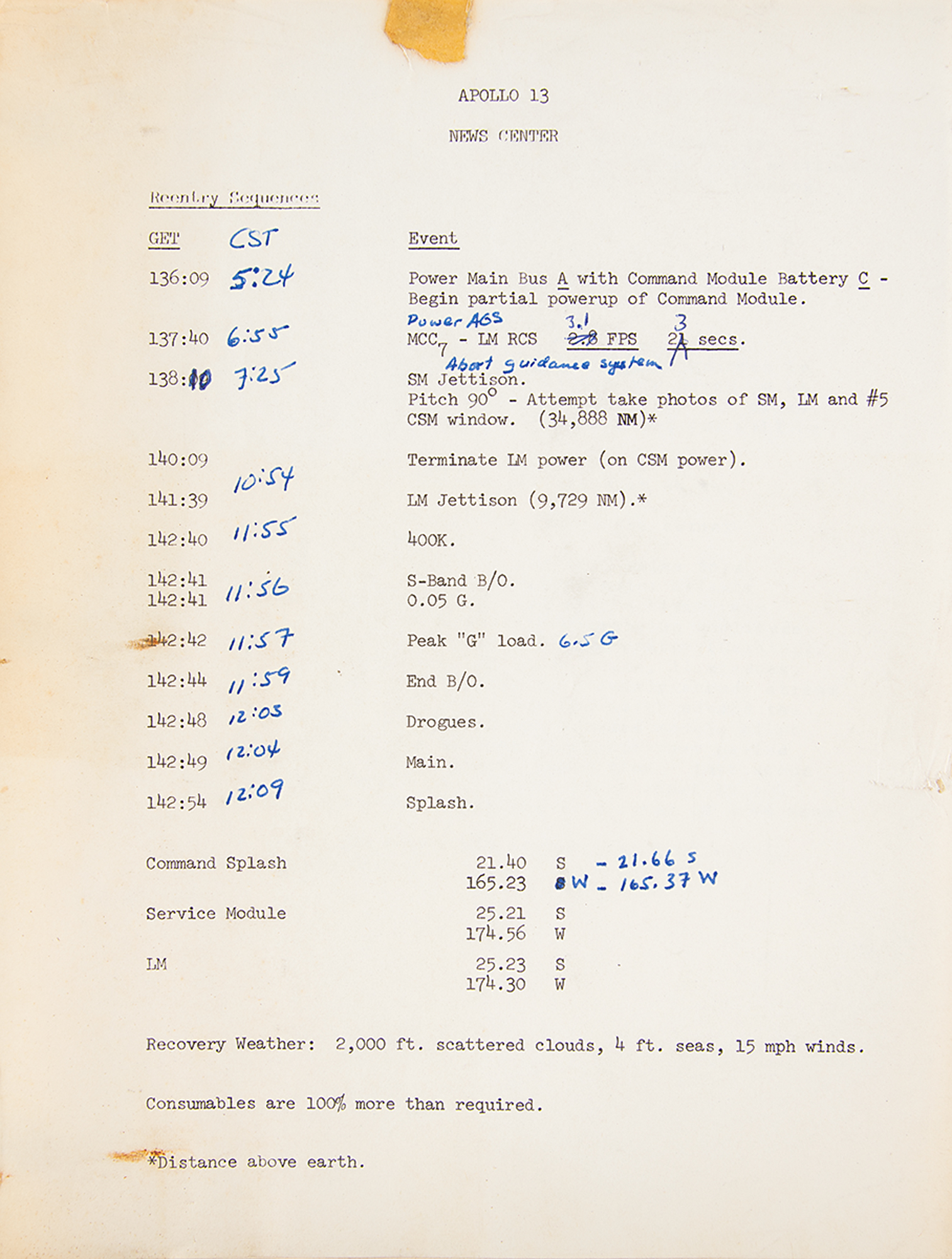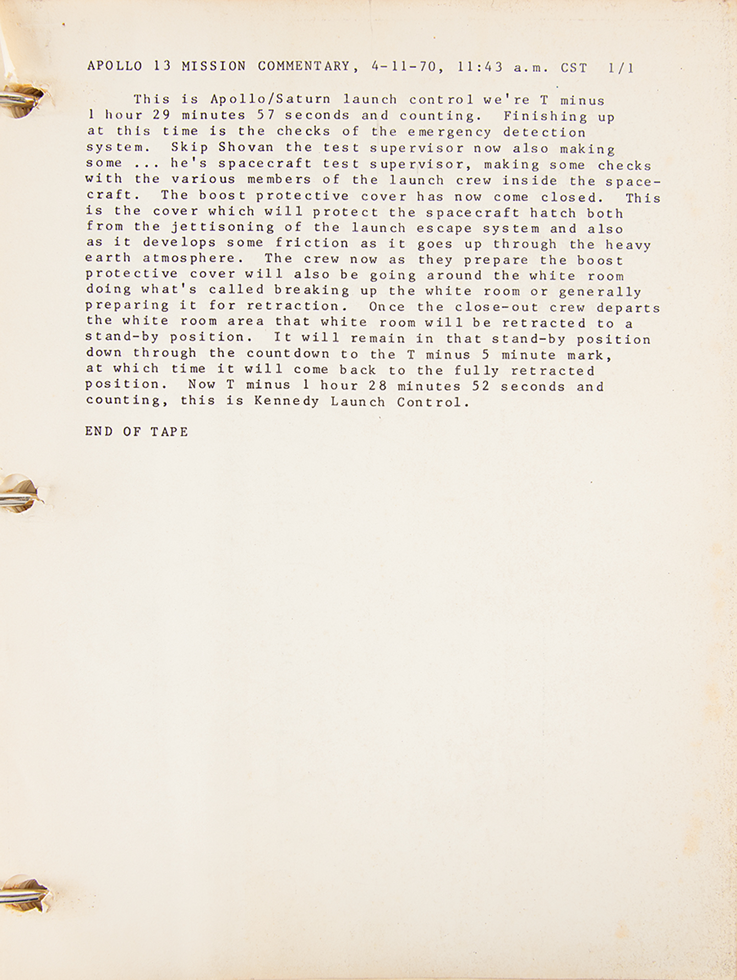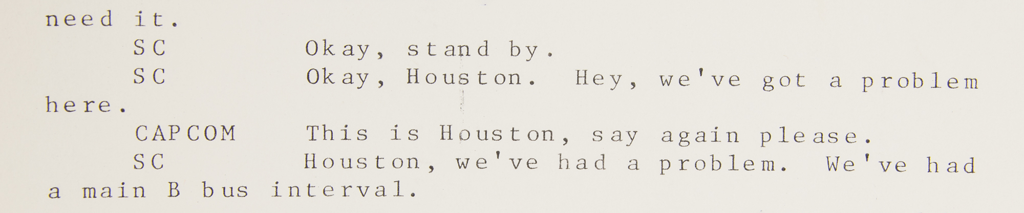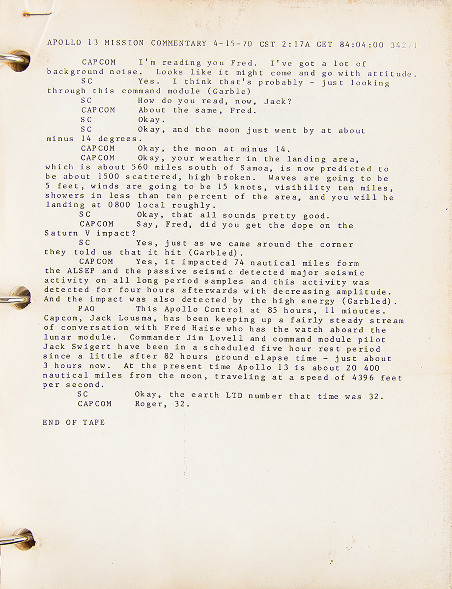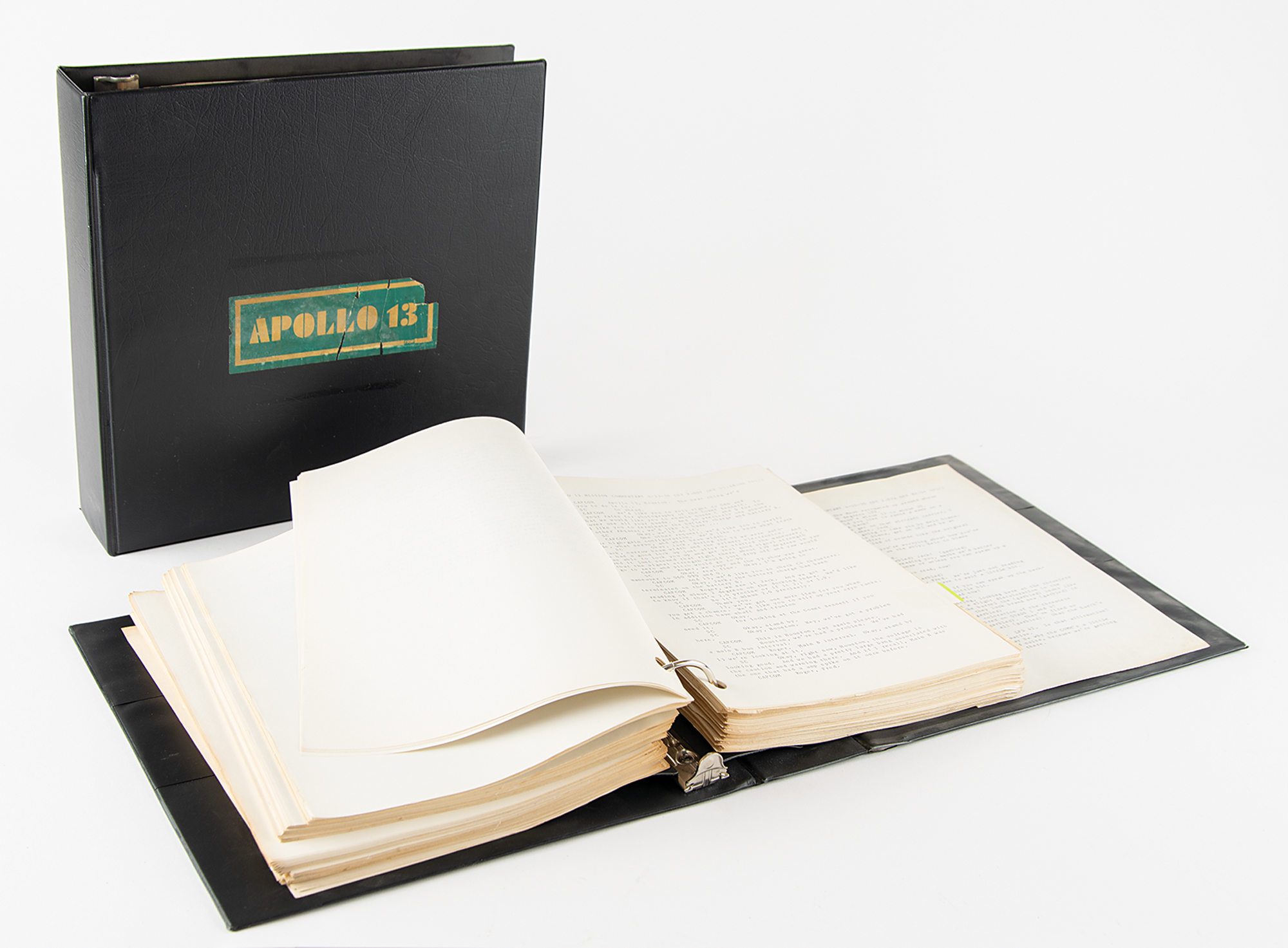 NASA Manned Spacecraft Center publication entitled "Apollo 13 Mission Commentary," 8 x 10.5, 635 pages, containing the official transcript of communications between Mission Control and the Apollo 13 astronauts throughout the duration of the near-catastrophic mission. These transcript packets were handed out to the press covering the historic event, and are now contained within two binders. The highlight of the transcript comes on page 169, in the crew's famous lines: "Okay, Houston. Hey, we've got a problem here?Houston, we've had a problem." The remainder chronicles their successful attempts to improvise a solution and use the LM as a 'lifeboat' to return home safely to Earth. A hand-annotated "Apollo 13 News Room" sheet is included. In very good to fine condition, with some scattered staining, toning, edge tears to one page, and heavy wear and edge splitting to the black binders.