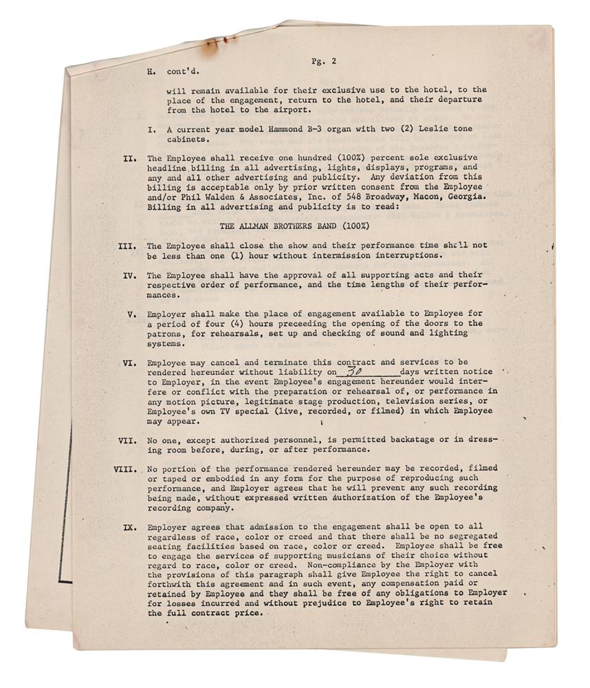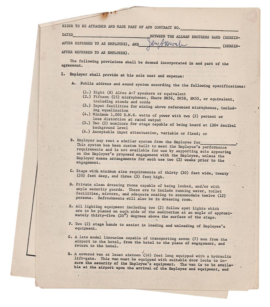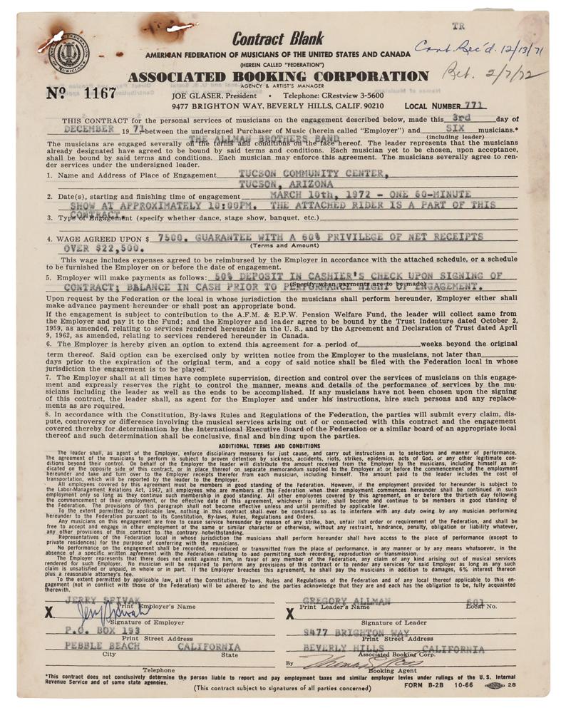 Concert contract for the Allman Brothers Band, one page, 8.5 x 11, December 3, 1971. Associated Booking Corporation contract blank engaging the Allman Brothers Band for a show at the Tucson Community Center in Arizona on March 10, 1972, for a "$7500 guarantee with a 60% privilege of net receipts over $22,500." Signed at the conclusion in ink by concert promoter Jerry Spivak and booking agent Thomas E. Ross. An attached six-page rider, also signed by Spivak and Ross, outlines the band's needs, including: "Eight (8) Altec A-7 speakers or equivalent?Fifteen (15) microphones, Shure SM56, SM58, SM53, or equivalent?A late model limousine capable of transporting seven (7) men?A current year model Hammond B-3 organ?and that there shall be no segregated facilities based on race, color or creed." In fine condition, with rusty staples to the upper left corner.