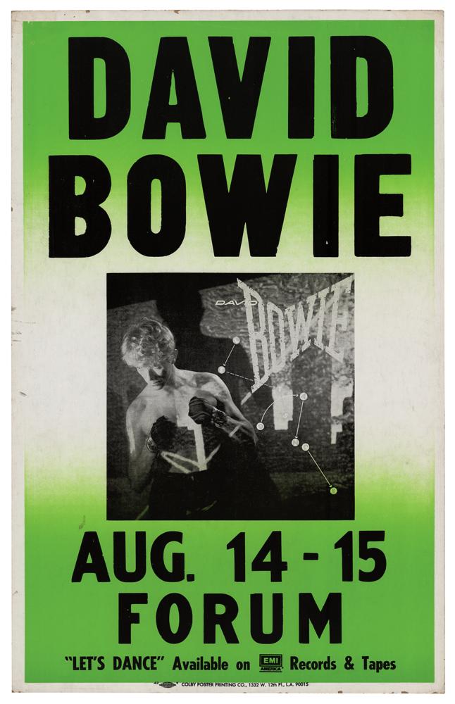 Appealing original color 14 x 22 concert poster for David Bowie at the Los Angeles Forum on August 14-15, 1983, featuring a great image of Bowie in a boxing pose. Printed by the Colby Poster Printing Co. In fine condition.