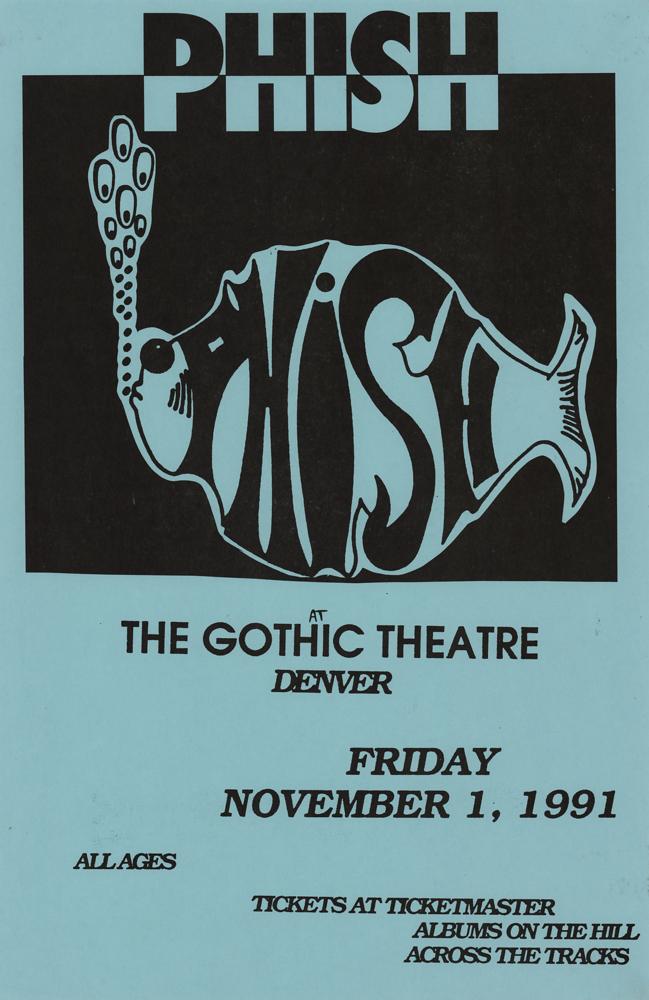 Original blue-and-black 11 x 17 concert poster for Phish at The Gothic Theatre in Denver, Colorado, on November 1, 1991, featuring the band's classic logo. In fine condition.