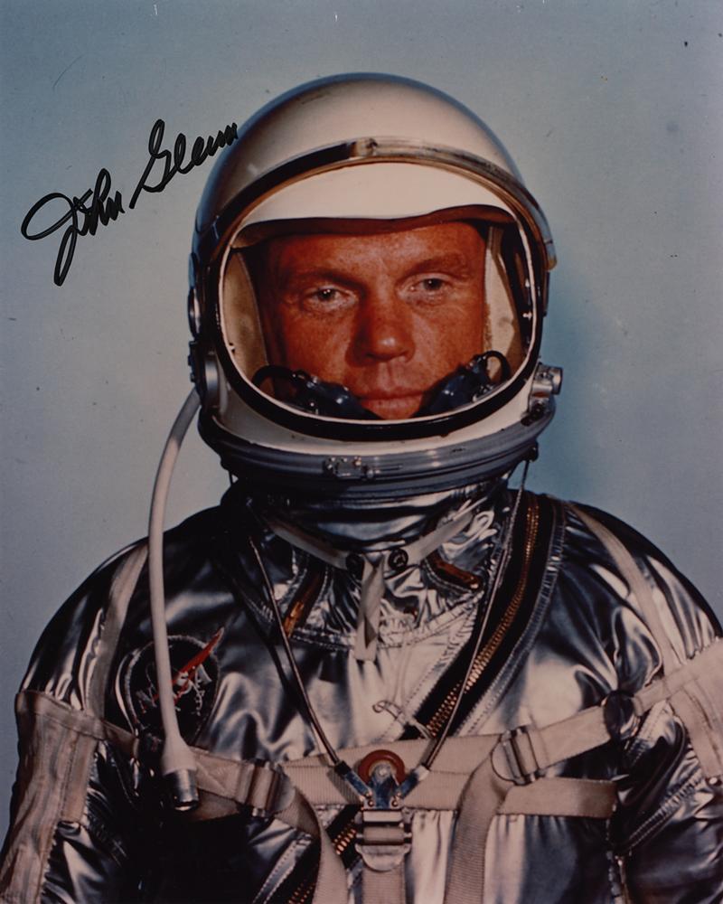 Color satin-finish 8 x 10 photo of John Glenn in his Project Mercury space suit, signed in black felt tip. In fine condition, with a slight bend along the bottom edge.