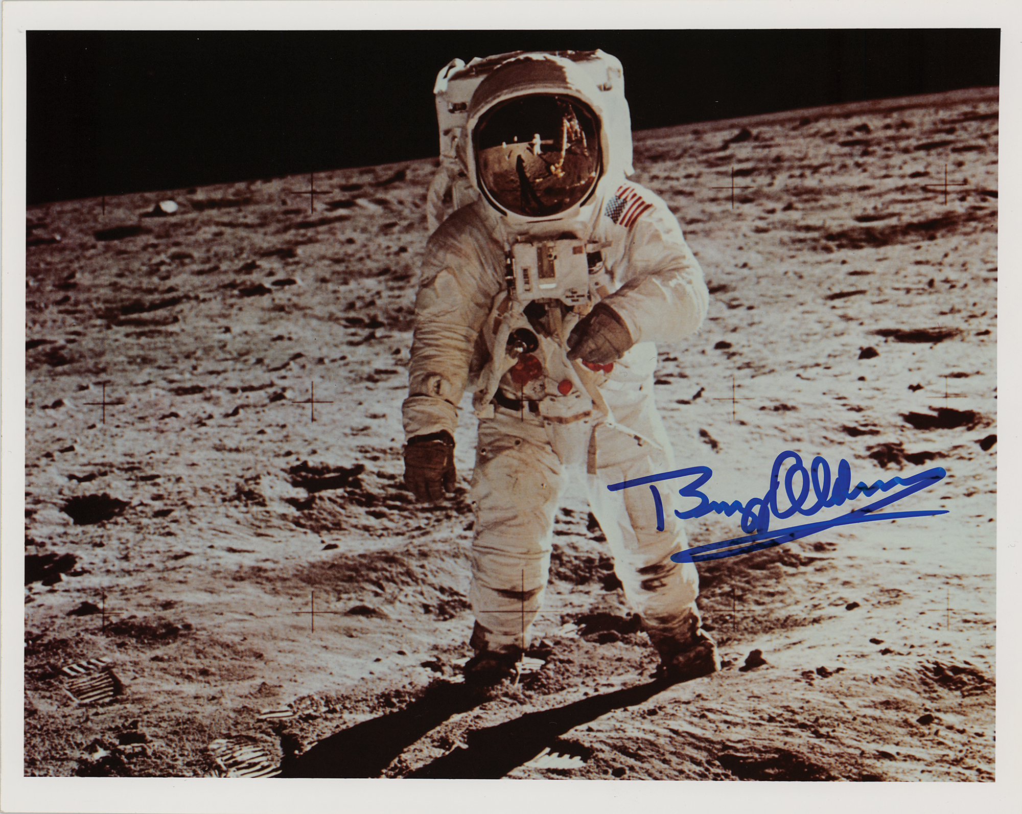 Choice color glossy 10 x 8 photo of Aldrin standing on the lunar surface, his visor showing a small reflection of the photographer, Neil Armstrong, signed in blue felt tip, "Buzz Aldrin." In very fine condition.