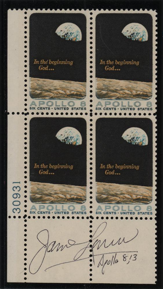 Appealing block of four six-cent postage stamps featuring the iconic Apollo 8 'Earthrise' image, signed in the lower border in black ballpoint, "James Lovell, Apollo 8, 13." In very fine condition.