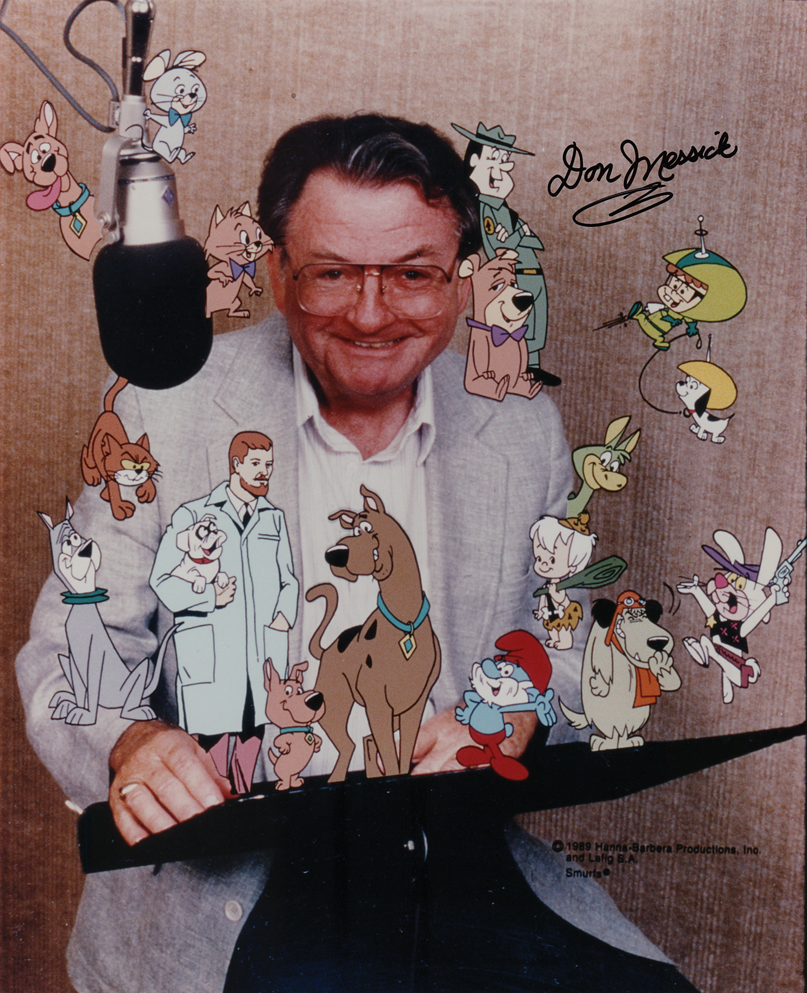 American voice actor (1926-1997) best known for his performances in Hanna-Barbera cartoons. His best-remembered vocal creations include Scooby-Doo, Bamm-Bamm Rubble and Hoppy in The Flintstones, Astro in The Jetsons, Muttley in Wacky Races and Dastardly and Muttley in Their Flying Machines, Boo-Boo Bear and Ranger Smith in The Yogi Bear Show, Sebastian the Cat in Josie and the Pussycats; Gears, Ratchet, and Scavenger in The Transformers, Papa Smurf and Azrael in The Smurfs, Hamton J. Pig in Tiny Toon Adventures, and Dr. Benton Quest in Jonny Quest. Color glossy 8 x 9.75 photo of the legendary voice actor and his various Hanna-Barbera creations, signed in black felt tip by Don Messick. In very fine condition. Originally obtained by in-person specialist Mike Wehrmann.