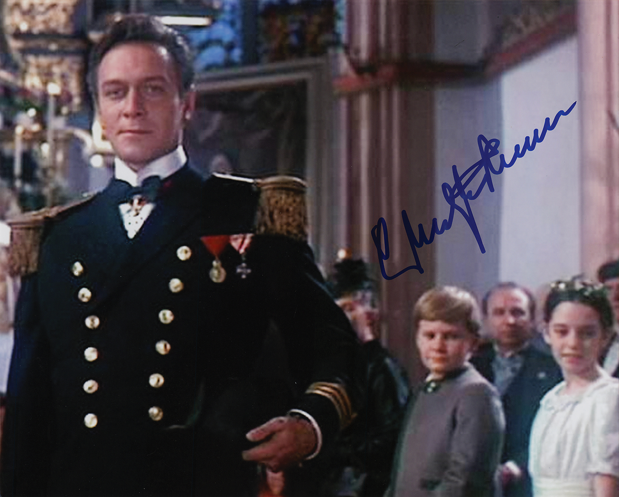 Color satin-finish 10 x 8 photo of Christopher Plummer as Captain Georg von Trapp in The Sound of Music, signed in blue felt tip. In fine condition, with slightly pixelated image quality. Originally obtained by in-person specialist Mike Wehrmann.