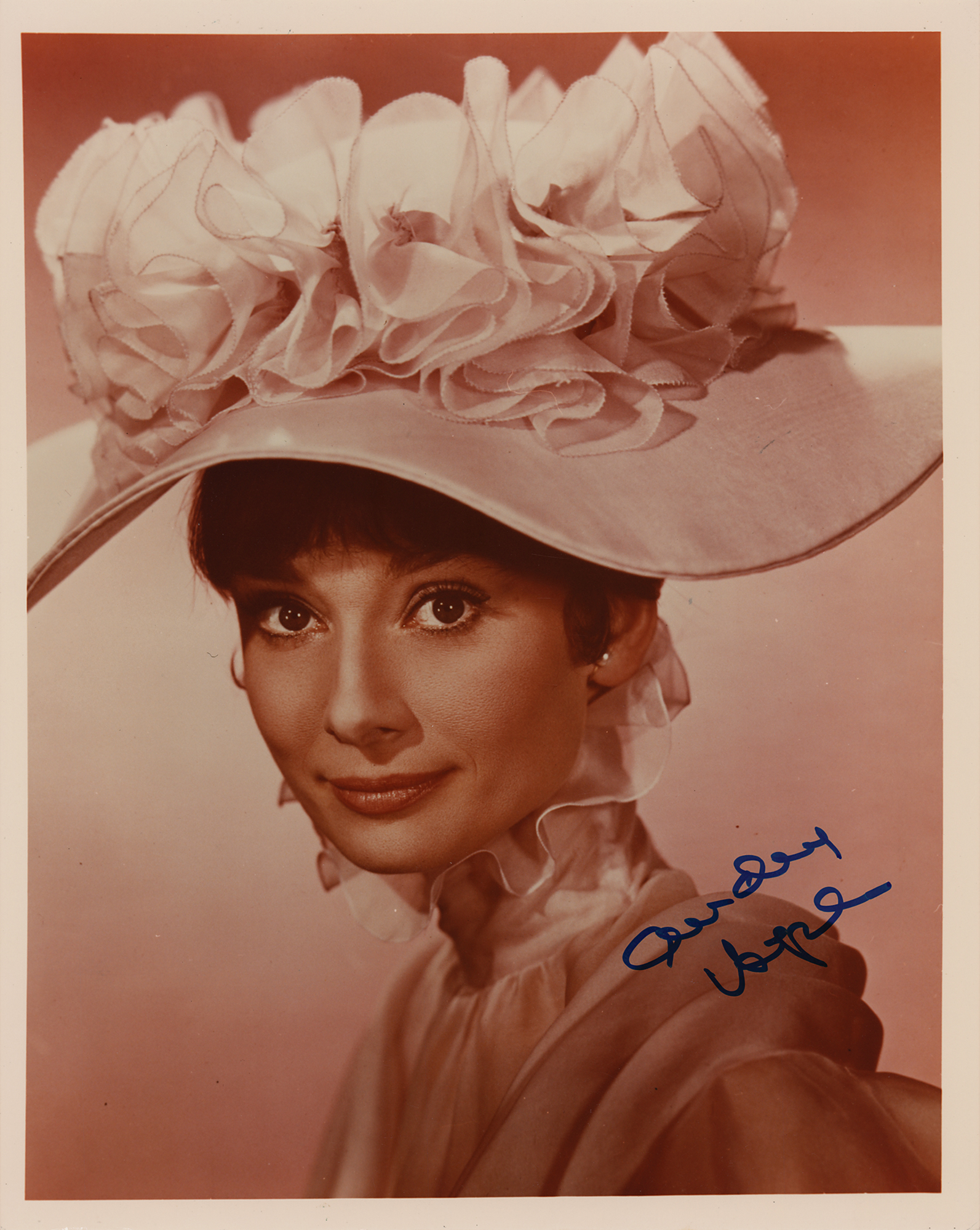 Lovely color glossy 8 x 10 close-up photo of Audrey Hepburn dressed as Eliza Doolittle for a My Fair Lady promo shoot, signed in blue felt tip. In fine condition. Originally obtained by in-person specialist Mike Wehrmann.