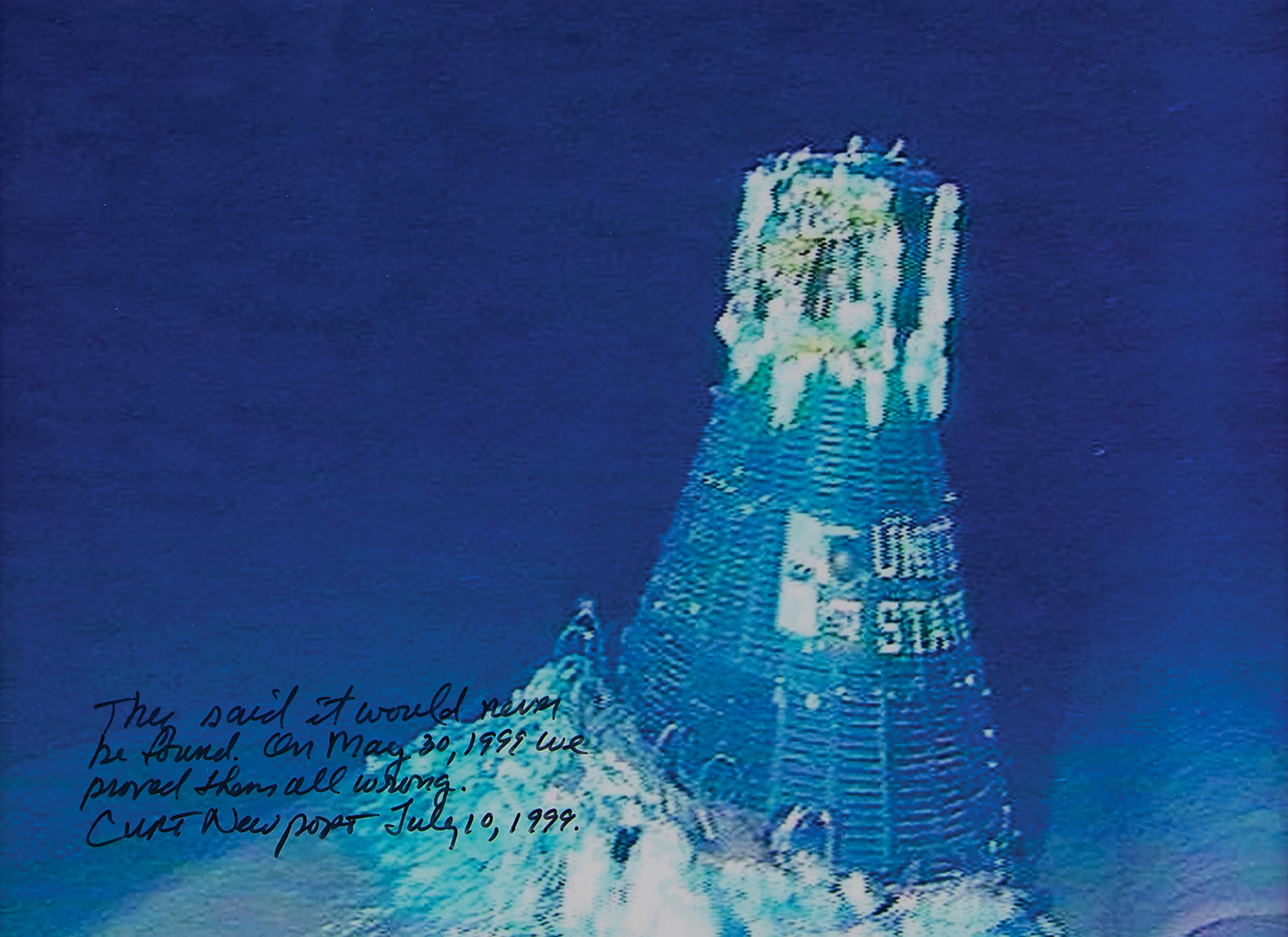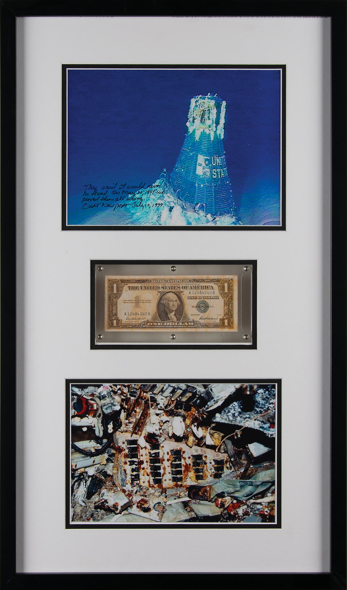 Incredible flown Series 1957 silver certificate one-dollar bill (A1248420B), one of five that were carried aboard the Liberty Bell 7 with astronaut Gus Grissom during the Mercury-Redstone 4 mission and recovered from the bottom of the Atlantic Ocean 38 years after splashdown. The dollar bill is mounted and displayed with color glossy photos of the Liberty Bell 7 resting at the bottom of Blake’s Basin, and another of the rusted interior of the spacecraft following its recovery; the former is signed in black felt tip, “They said it would never be found. On May 30, 1999, we proved them all wrong. Curt Newport, July 10, 1999.” Matted and framed to an overall size of 16 x 27; the acrylic frame backing reveals a back view of the banknote.