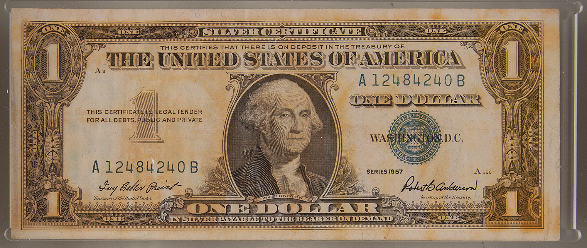 Accompanied by a signed letter of authenticity from Newport, who states: “I certify that this Silver Certificate Dollar Bill, Series 1957; No. A12484240B, was gifted to me in December of 1999 by the Kansas Cosmosphere and Space Center following its discovery in the Liberty Bell 7 Mercury spacecraft. This dollar bill is one of five found inside of the spacecraft wrapped around a wiring bundle and hidden by shrink tubing.”