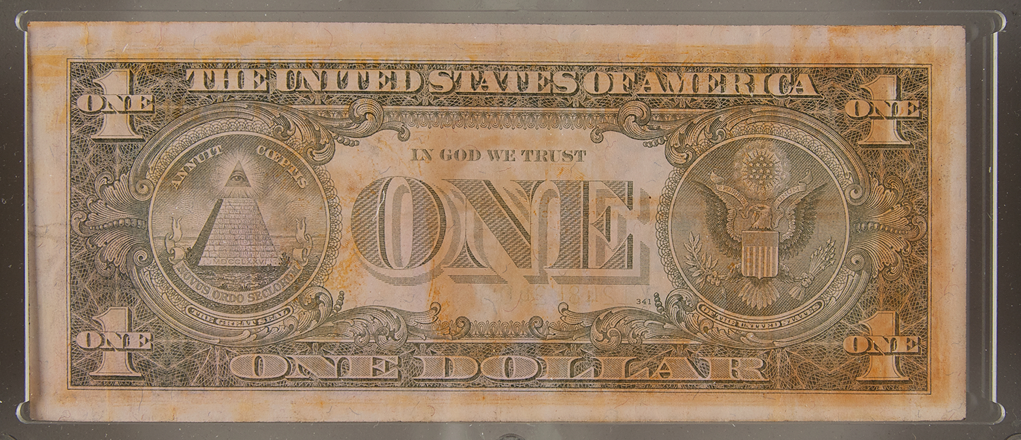 Flown one-dollar bill hidden inside the Liberty Bell 7 spacecraft, recovered from the bottom of the Atlantic Ocean after 38 years