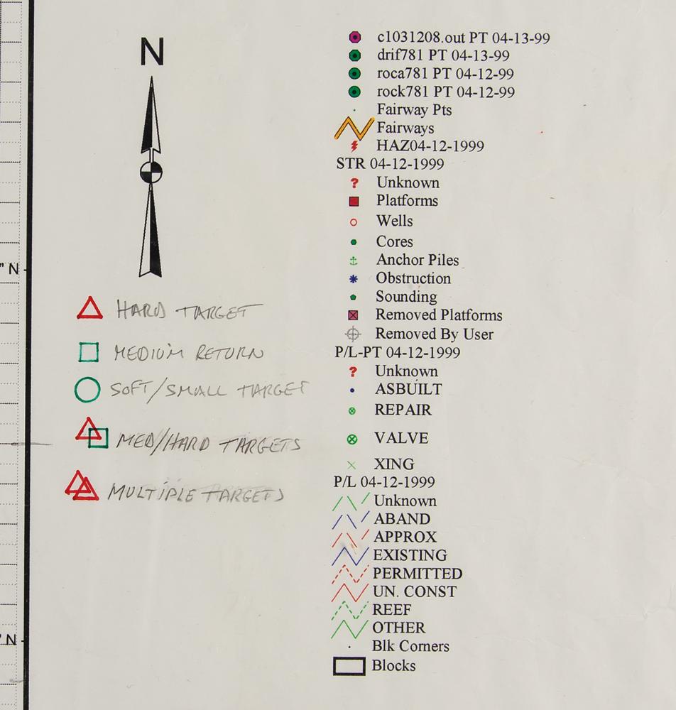 The chart contains several layers of navigational data for 1961 pre-flight, 1961 post-flight, and the 1999 side-scan sonar targets. The boxes identifying the locations indicate from which NASA STG document the information derives, whether the data was numerical or graphical in nature, and the corresponding publication date. The critical characteristics of this chart are the color-coding and the shape of the symbols representing the 88 sonar targets identified by the Ocean Explorer 6000 sonar. Fifteen of these targets were deemed worthy of further investigation and grouped into three areas, each representing a dive evolution. The symbols and colors represent three categories of sonar contacts: singular hard target (red triangle), green square (multiple grouped contacts), and brown circle (soft targets). The filtering of the targets using this technique allowed the team to make operational decisions by comparing the sonar data against the estimated 1961 locations. Newport placed considerable weight on the FPS-16 radar location generated from the Grand Bahama Island tracking station because it was raw radar data and because he believed in the accuracy of this radar in the automatic beacon mode. Newport knew this because, before the search mission, he tracked down and interviewed the engineer who calibrated the radar before Grissom’s flight. Rolled and in very good to fine condition, with a missing lower right corner, and some small tears, creases, and tape remnants to edges.