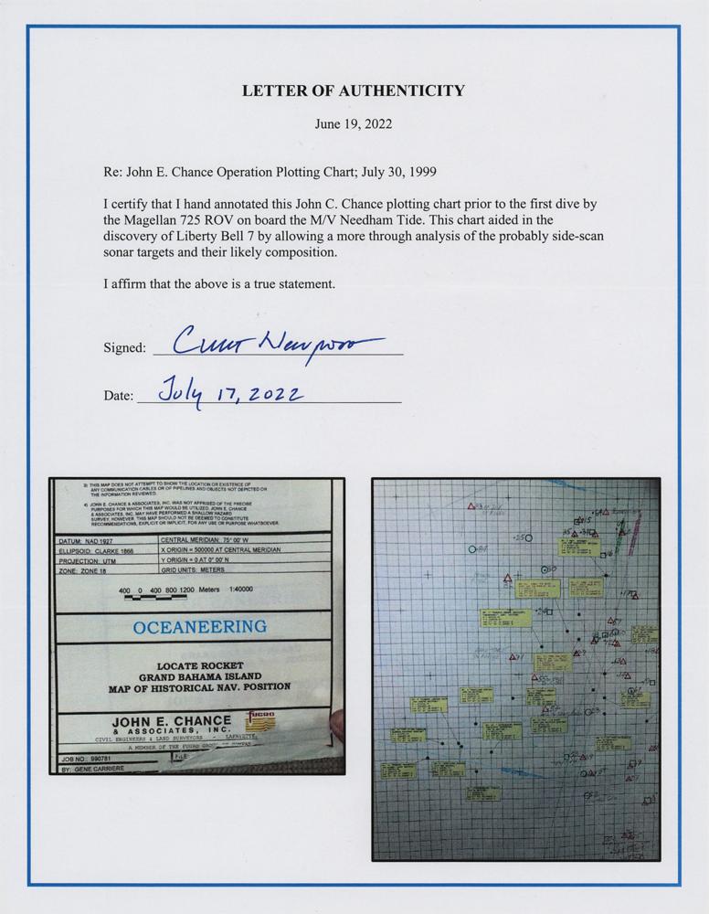Accompanied by a signed letter of authenticity from Newport, who states: “I certify that I hand annotated this John E. Chance plotting chart prior to the first dive by the Magellan 725 ROV on board the M/V Needham Tide. This chart aided in the discovery of the Liberty Bell 7 by allowing a more thorough analysis of the probably side-scan sonar targets and their likely comparison.”