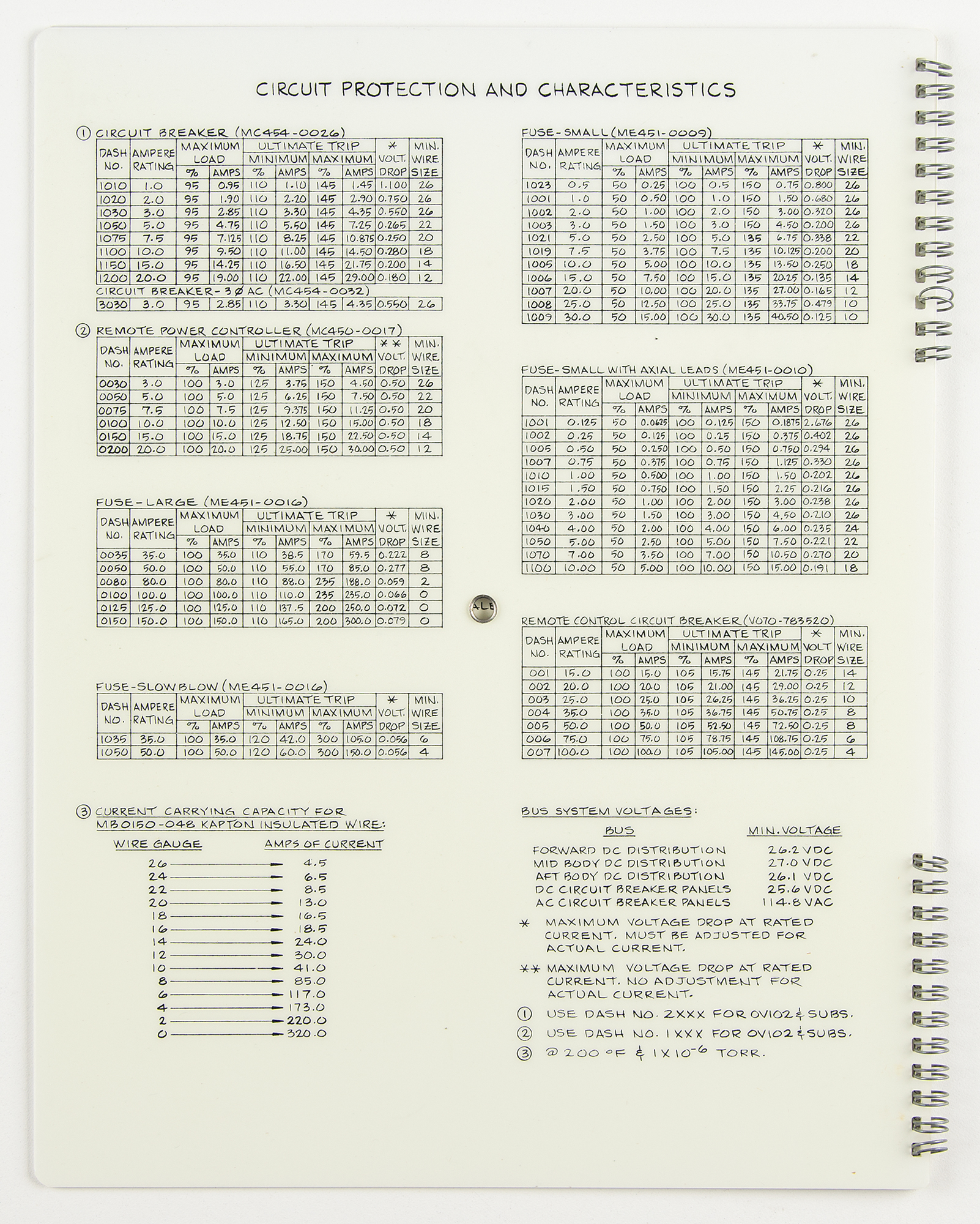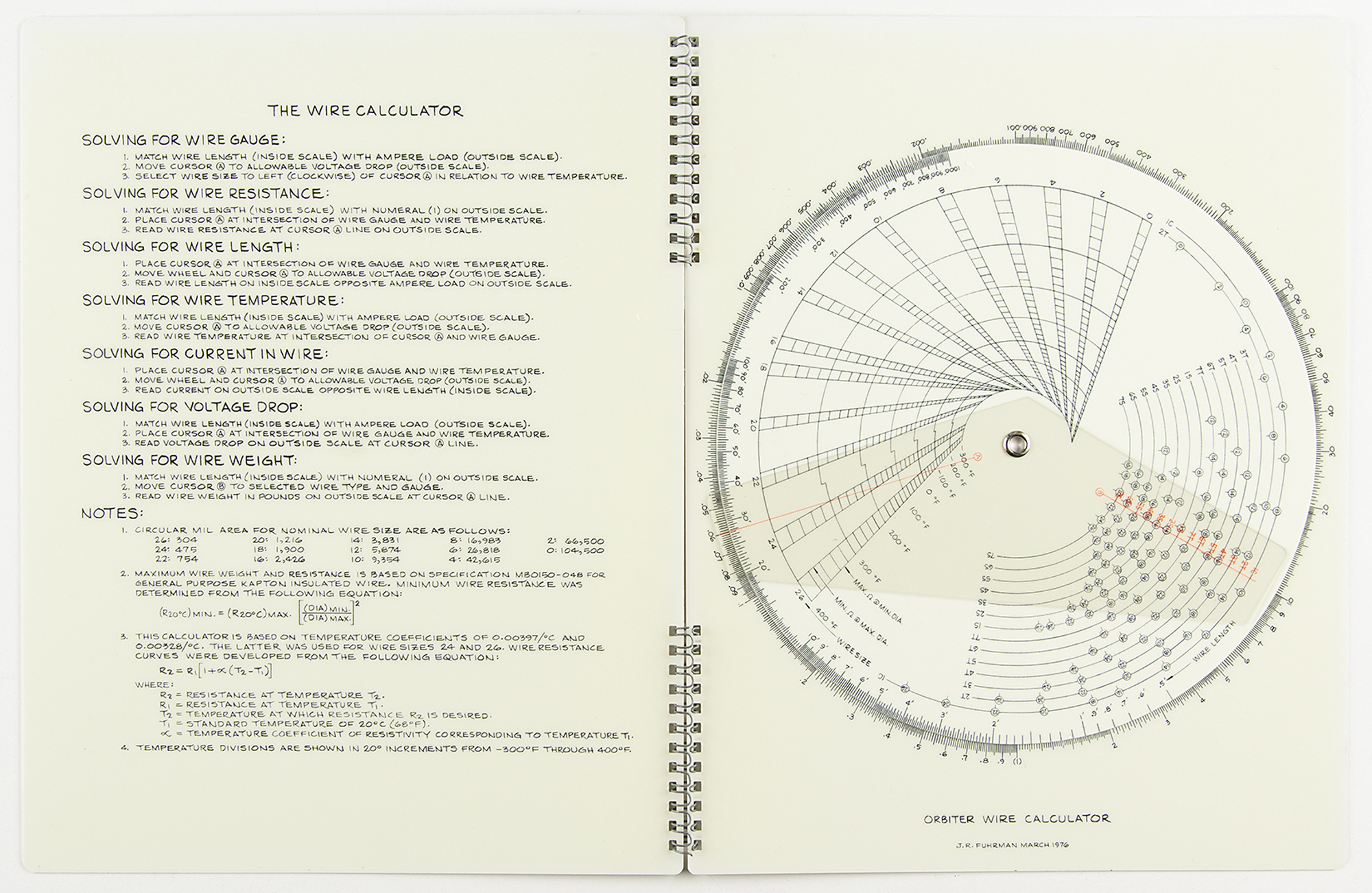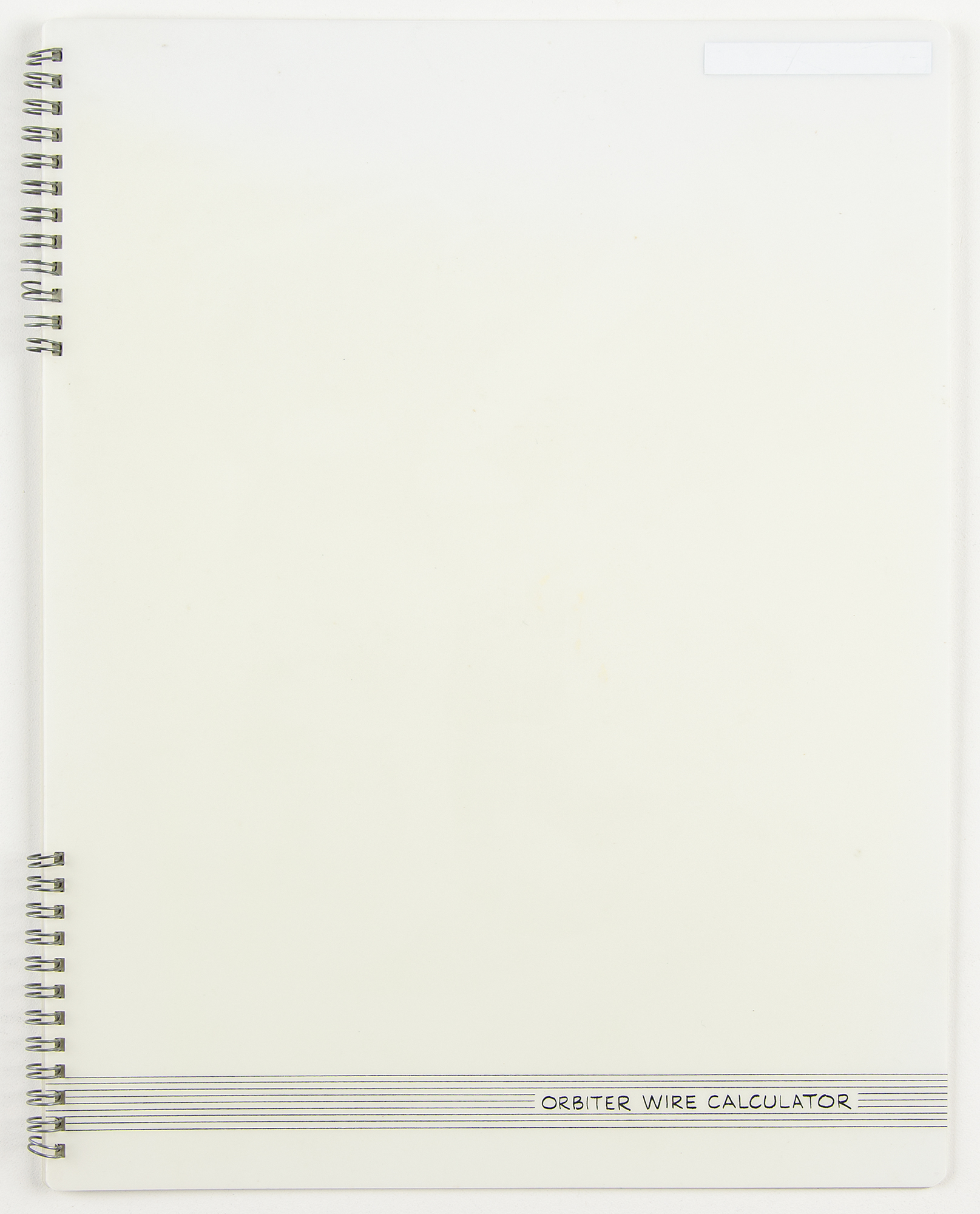Uncommon spiral-bound “Orbiter Wire Calculator” booklet from the Space Shuttle program, 8.5 x 11, with the interior containing a rotating calculator and a list of steps for solving wire gauge, resistance, length, temperature, current, voltage drop, and weight, with the back cover featuring several charts and lists relative for “Circuit Protection and Characteristics.” Designed by J. R. Fuhrman in March 1976. In fine condition.