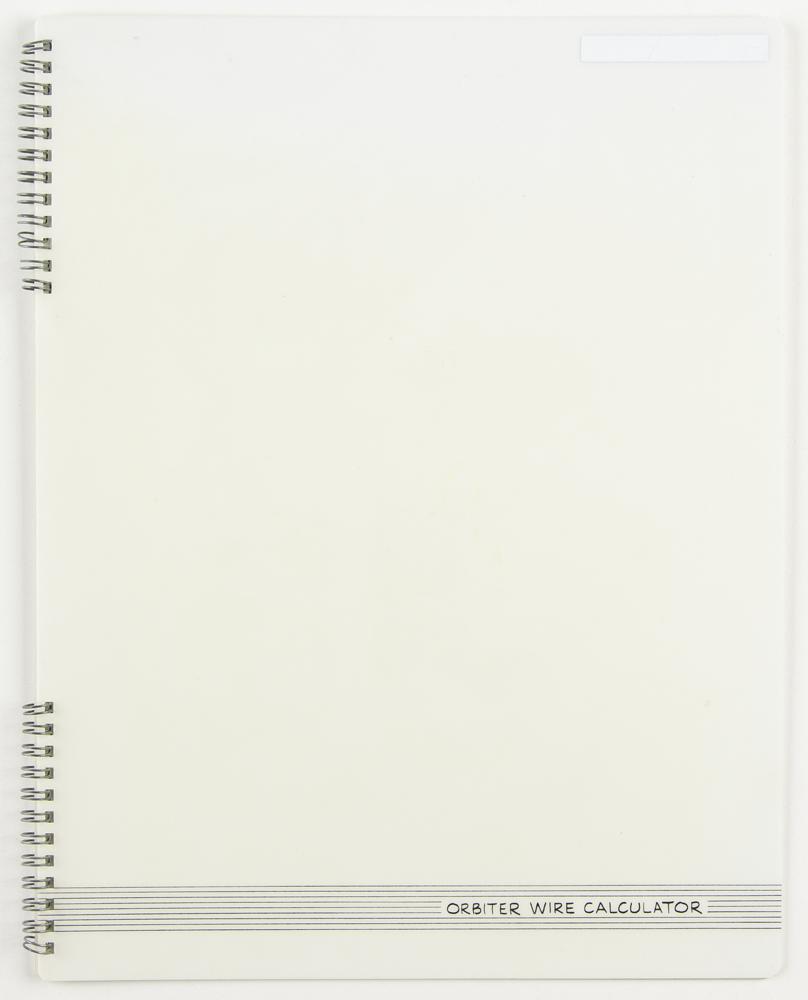 Uncommon spiral-bound “Orbiter Wire Calculator” booklet from the Space Shuttle program, 8.5 x 11, with the interior containing a rotating calculator and a list of steps for solving wire gauge, resistance, length, temperature, current, voltage drop, and weight, with the back cover featuring several charts and lists relative for “Circuit Protection and Characteristics.” Designed by J. R. Fuhrman in March 1976. In fine condition.