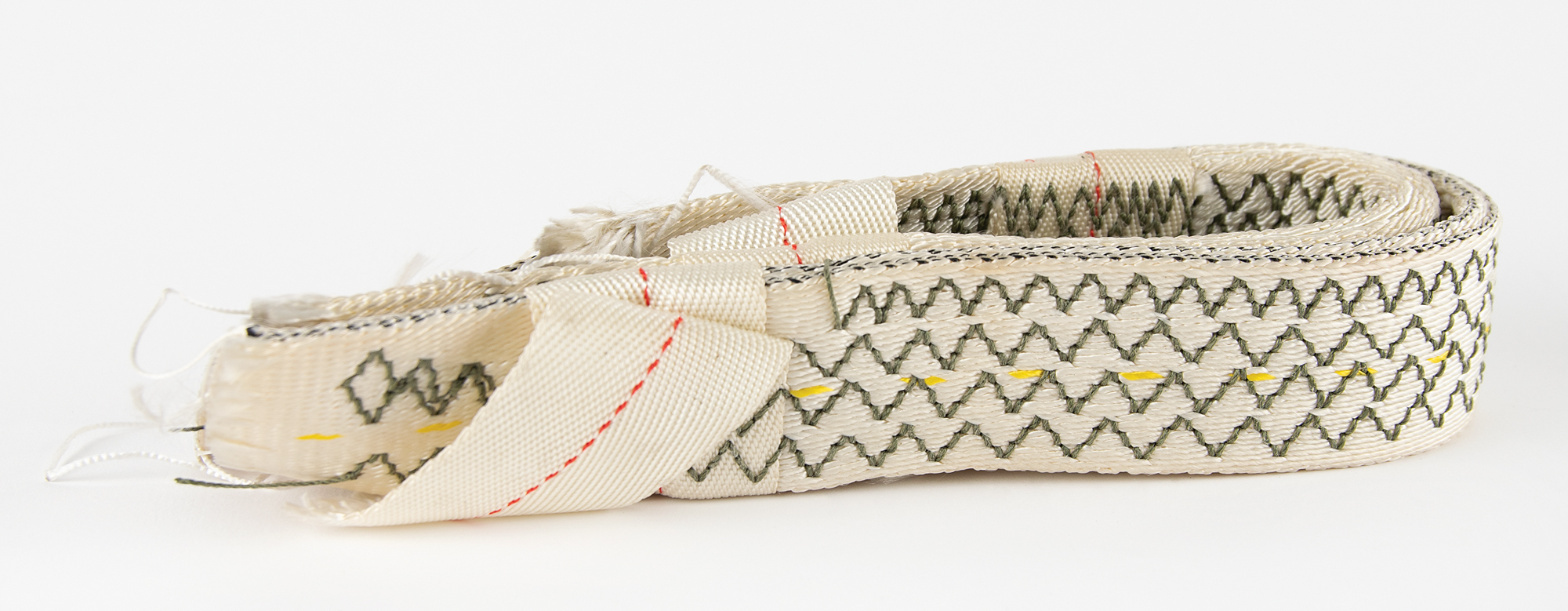 Pair of heavy-duty nylon parachute risers designed to safely lower reusable Space Shuttle Solid Rocket Boosters (SRB). The pieces measure 17.5″ and 22″ in length and each feature a pair of cut strap ends. In overall fine condition. SRBs are lowered to the ocean for recovery by the deployment of three separate sets of parachutes. These parachutes are attached to the boosters by a series of risers made of heavy-duty nylon webbing. The parachutes are manufactured and refurbished for reuse at the Parachute Refurbishment Facility at the Kennedy Space Center.