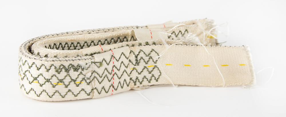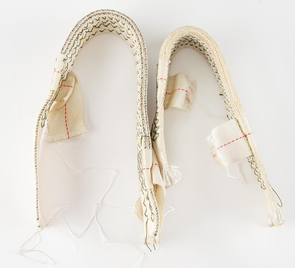 Pair of heavy-duty nylon parachute risers designed to safely lower reusable Space Shuttle Solid Rocket Boosters (SRB). The pieces measure 17.5″ and 22″ in length and each feature a pair of cut strap ends. In overall fine condition. SRBs are lowered to the ocean for recovery by the deployment of three separate sets of parachutes. These parachutes are attached to the boosters by a series of risers made of heavy-duty nylon webbing. The parachutes are manufactured and refurbished for reuse at the Parachute Refurbishment Facility at the Kennedy Space Center.
