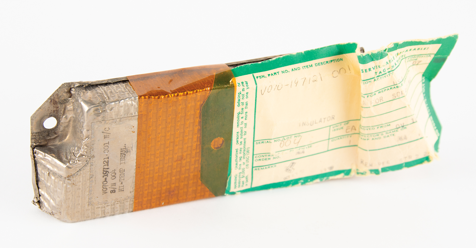 Insulation block from the Space Shuttle Columbia (OV-102) orbiter, 7″ x 2.75″ x .75″, with parts label stamped “V070-197121-001 N/C, S/N 004, HI-TEMP INSUL.” The block bears a tape-affixed ‘unserviceable’ DD Form, date-stamped October 1997, with matching part number and the ‘Reason for Reparable Condition’ field marked “HDA for scrapping.” In fine condition. This insulation block is assumed to be flown by consignor.