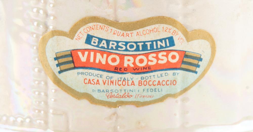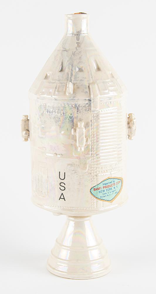 Vintage red wine decanter in the shape of the Apollo 11 Command Module Columbia, standing 11″ in height and 5″ in diameter, which contained one quart of Vino Rosso by Barsottini of Italy, where it was manufactured in 1969. Imported by Banfi Products Corp., of New York. The decanter retains its original cork and labels and features an American flag with “United States-11” to the upper command module section. The interior of the service propulsion engine nozzle bears the maker and importer stamp. In fine, empty condition.
