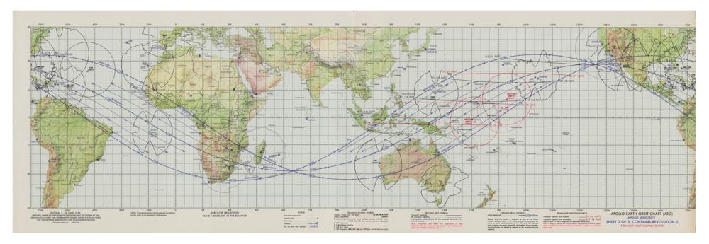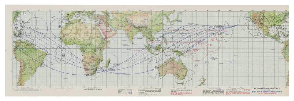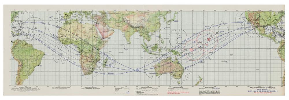 Set of three original first edition Apollo 11 Earth Orbit Charts, each 41.5 x 13.5, prepared for NASA under the direction of the Department of Defense by the Aeronautical Chart and Information Center, dated June 19, 1969. Charts outline the first three orbits around the Earth by the Apollo 11 spacecraft and are labeled in the lower right, "Apollo Earth Orbit Chart (AEO), Apollo Mission 11?For July 1969 Launch Dates." Folded and in fine condition, with a few wrinkles.
