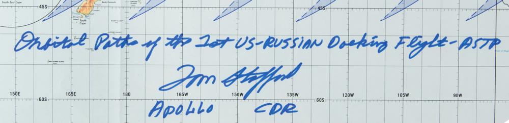 Desirable color 'training edition' of the Apollo-Soyuz Test Project Earth Observation Map, 39.75 x 19.25, dated December 1974, boldly signed in blue felt tip, "Orbital paths of the 1st US-Russian Docking Flight—ASTP, Tom Stafford, Apollo CDR." In fine condition, with intersecting folds.