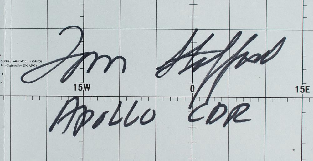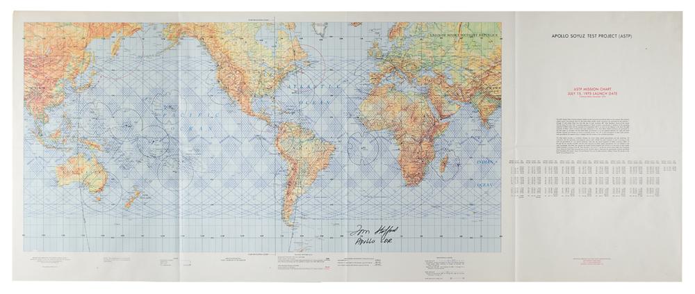 Desirable color 'training edition' of the Apollo-Soyuz Test Project (ASTP) Mission Chart, 55 x 22.25, dated December 1974, signed in black felt tip, "Tom Stafford, Apollo CDR." The large chart shows groundtrack data for a July 15, 1975 launch date. In fine condition, with intersecting folds.