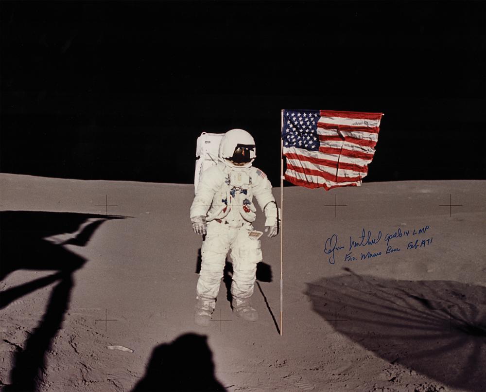 Color satin-finish 20 x 16 photo of Mitchell posing beside the American flag on the lunar surface during an Apollo 14 EVA, signed in blue felt tip, "Edgar Mitchell, Apollo 14 LMP, Fra Mauro Base, Feb. 1971." In fine condition, with light emulsion irregularity along the top edge.