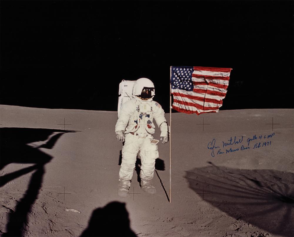 Color satin-finish 20 x 16 photo of Mitchell posing beside the American flag on the lunar surface during an Apollo 14 EVA, signed in blue felt tip, "Edgar Mitchell, Apollo 14 LMP, Fra Mauro Base, Feb. 1971." In fine condition, with light emulsion irregularity along the top edge.