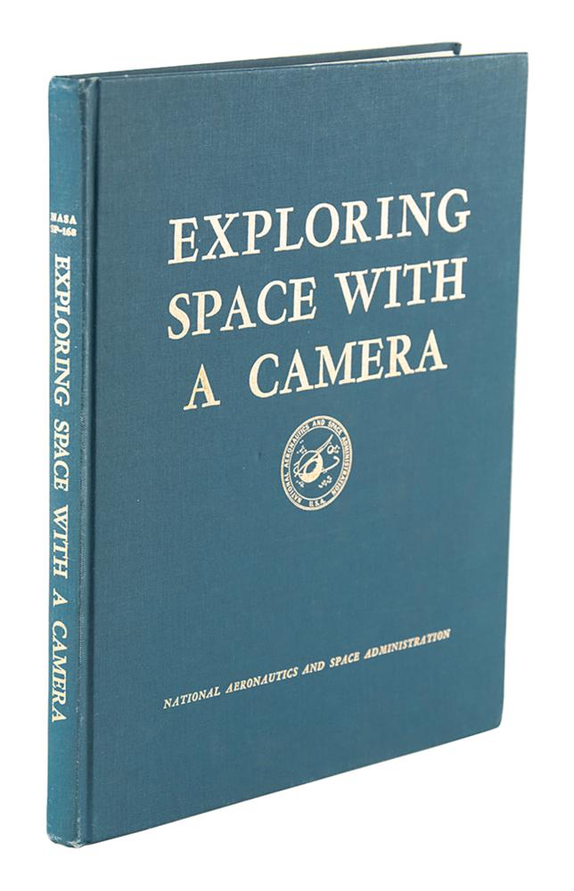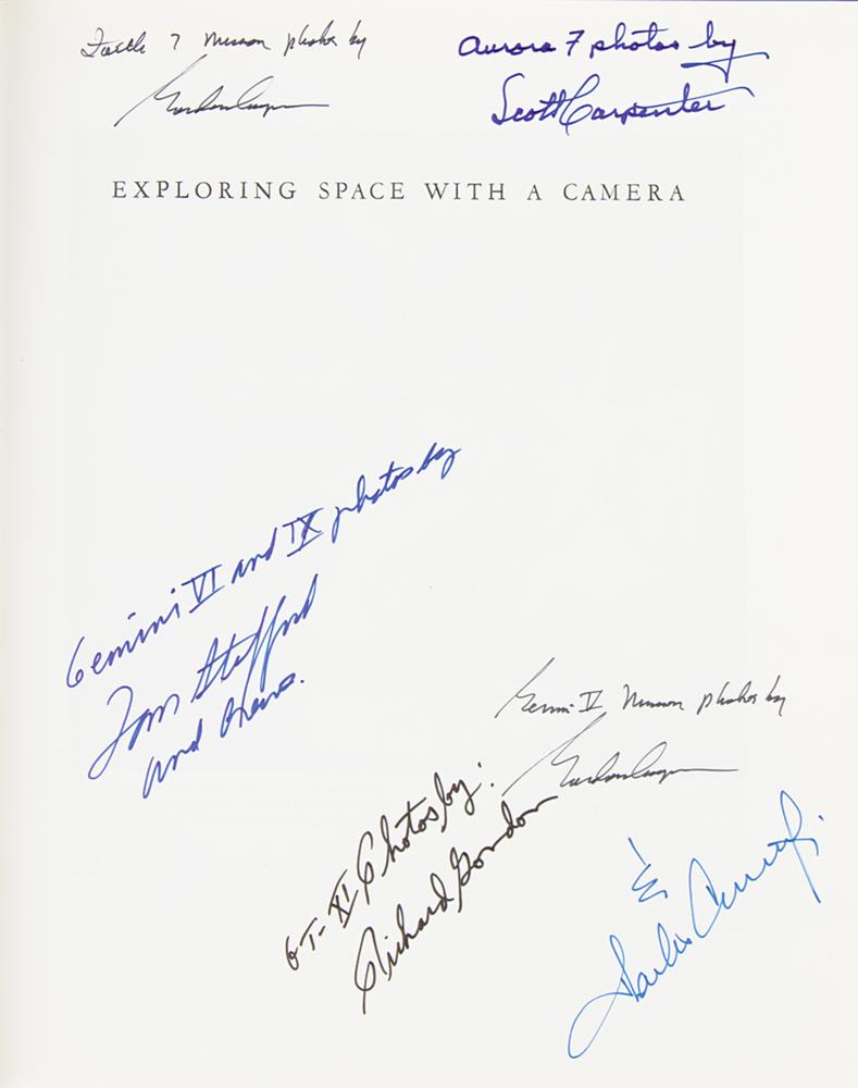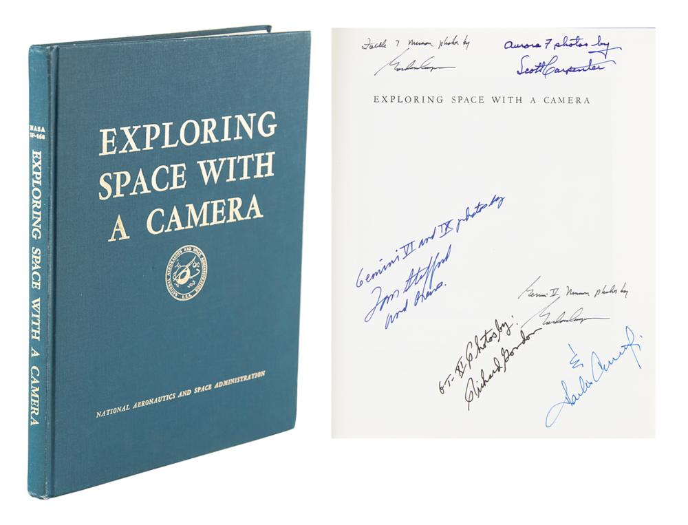 Signed book: Exploring Space with a Camera. First edition. Washington, DC: NASA, 1968. Hardcover, 9.5 x 11.75, 214 pages. Signed on the half-title page in felt tip by five Mercury and Gemini astronauts, with Cooper signing twice: "Aurora 7 photos by Scott Carpenter," "Faith 7 mission photos by Gordon Cooper," "Gemini V mission photos by Gordon Cooper," "Gemini VI and IX photos by Tom Stafford and Crews," "GT-XI Photos by Richard Gordon," and "& Charles Conrad, Jr." In very good to fine condition, with light wear to the covers, and white staining or mildew to back cover. A fantastic multi-signed volume chronicling the breathtaking photography of the early manned space program.