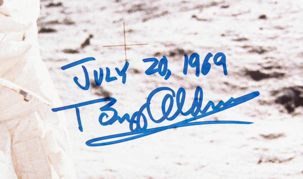 Magnificent color semi-glossy 20 x 16 full-length photo of Aldrin standing on the lunar surface, his visor showing a small reflection of the photographer, Neil Armstrong, signed in blue felt tip, "July 20-21, 1969, Buzz Aldrin." In fine condition. An immense example of history's most iconic space image that boasts an excellent Aldrin autograph.