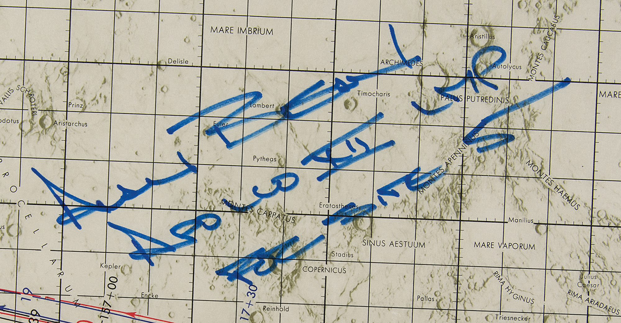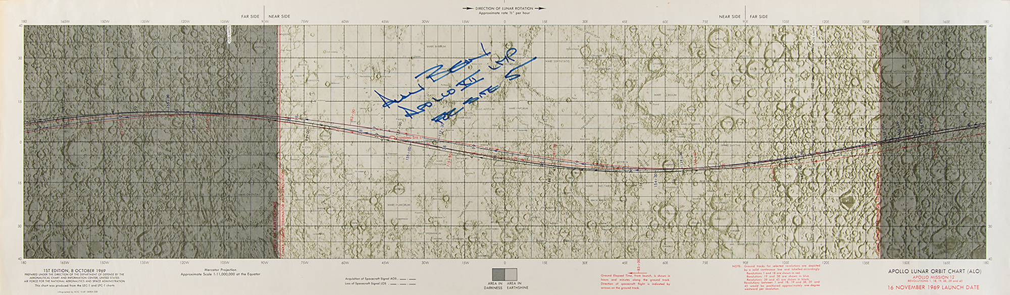 Color first edition of the Apollo 12 Lunar Orbit Chart, scale 1:11,000,000 at the equator, 41 x 12, dated October 8, 1969, signed in blue felt tip next to the Ocean of Storms landing site, "Alan Bean, Apollo XII LMP, For Site 5.” The chart displays areas in darkness and earthshine, lunar sunset and sunrise terminator lines for lunar revolutions, and a wide assortment of lunar landmarks and regions. Titled in the lower right corner, "Apollo Lunar Orbit Chart (ALO), Apollo Mission 12, Revolutions 1, 18, 19, 38, 39, and 45, 16 November 1969 Launch Date." Lithographed by ACIC 10-69, and prepared under the direction of the Department of Defense by the Aeronautical Chart and Information Center. Rolled and in fine condition, with some light unobtrusive creasing.