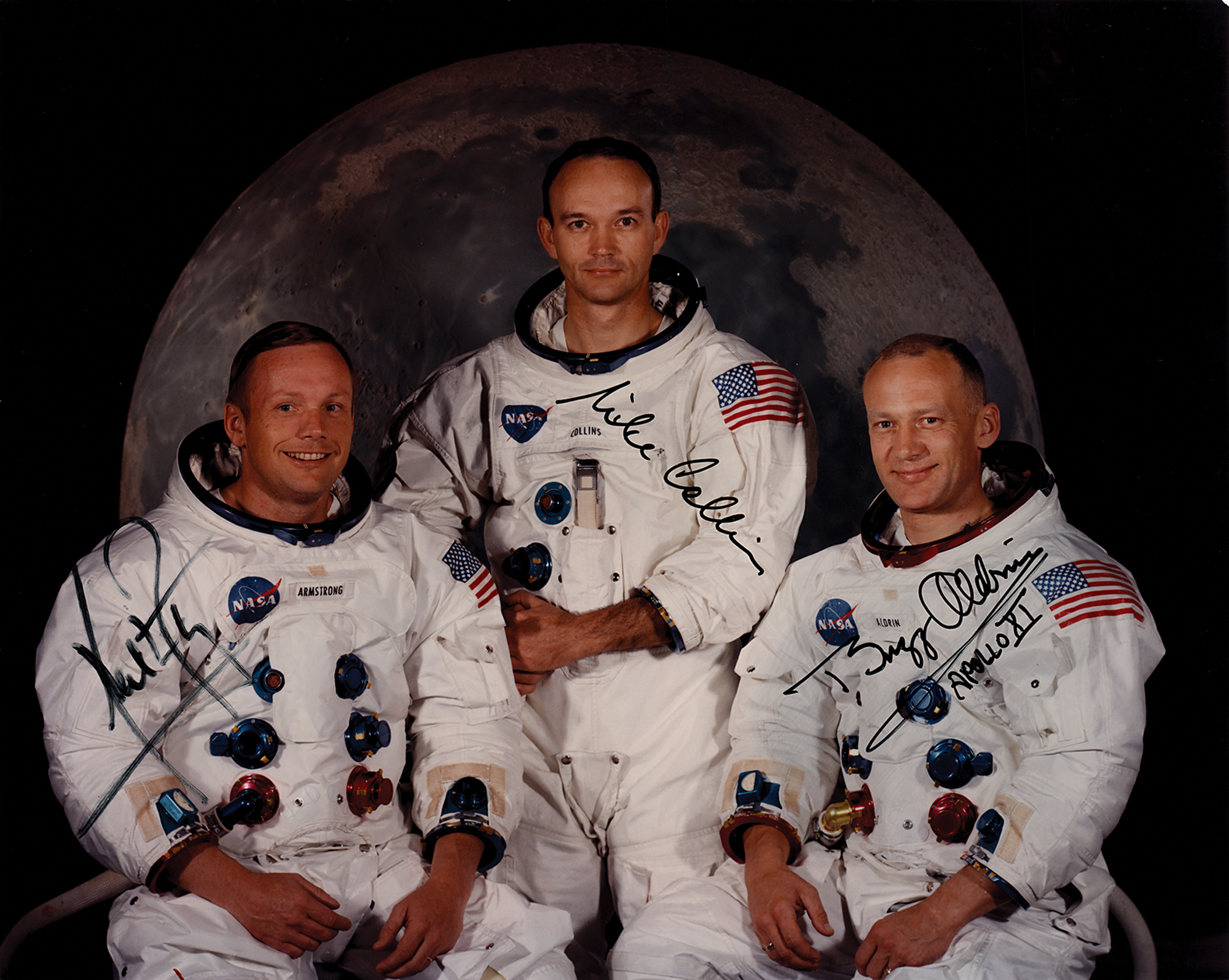 Coveted semi-glossy 10 x 8 photo of the Apollo 11 crew posing together in their white space suits against a lunar backdrop, signed in black felt tip by Neil Armstrong, Michael Collins, and Buzz Aldrin, who adds "Apollo XI." In fine condition, with a couple trivial bends near top edge. A very desirable and uninscribed example of the Apollo program's most famous trio.