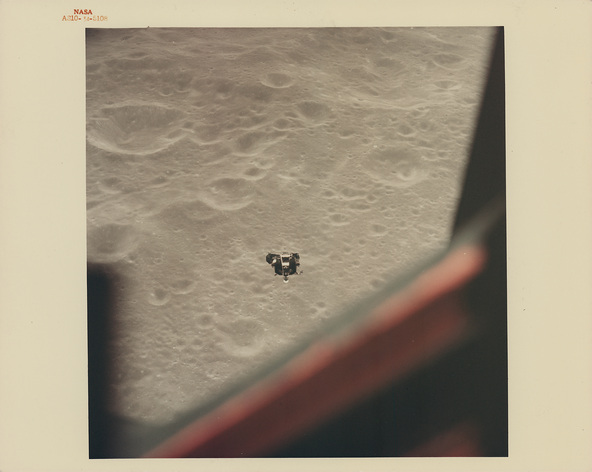 Dramatic official color glossy 10 x 8 numbered NASA photo (AS10-34-5108) of the Apollo 10 Lunar Module Ascent Stage photographed from inside the Command Module prior to docking in lunar orbit, with the moon's surface seen in the background. Reverse bears "A Kodak Paper" watermarks. In fine condition, with a couple trivial surface creases.