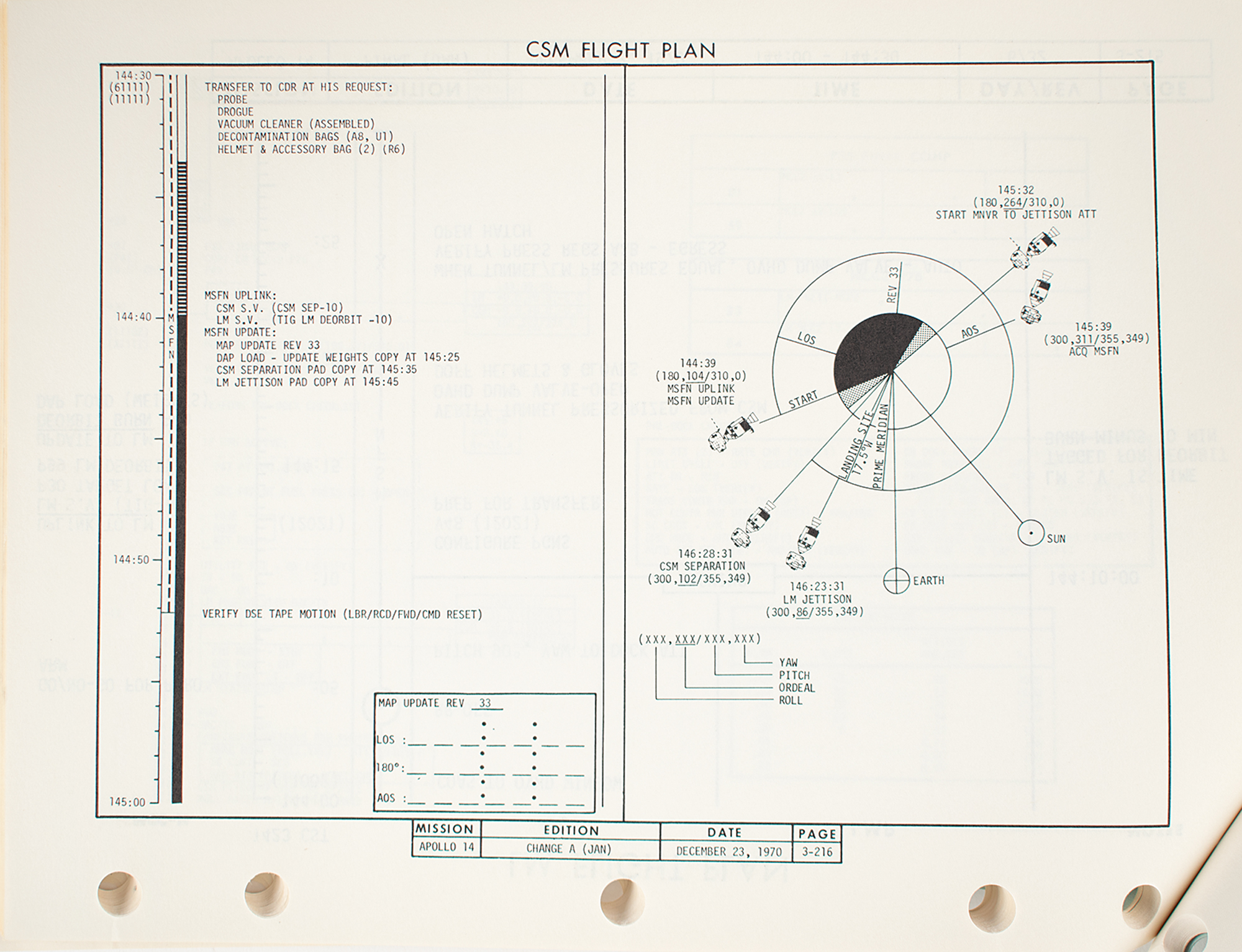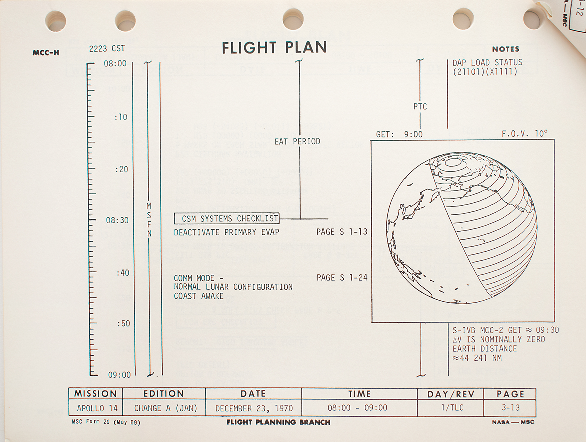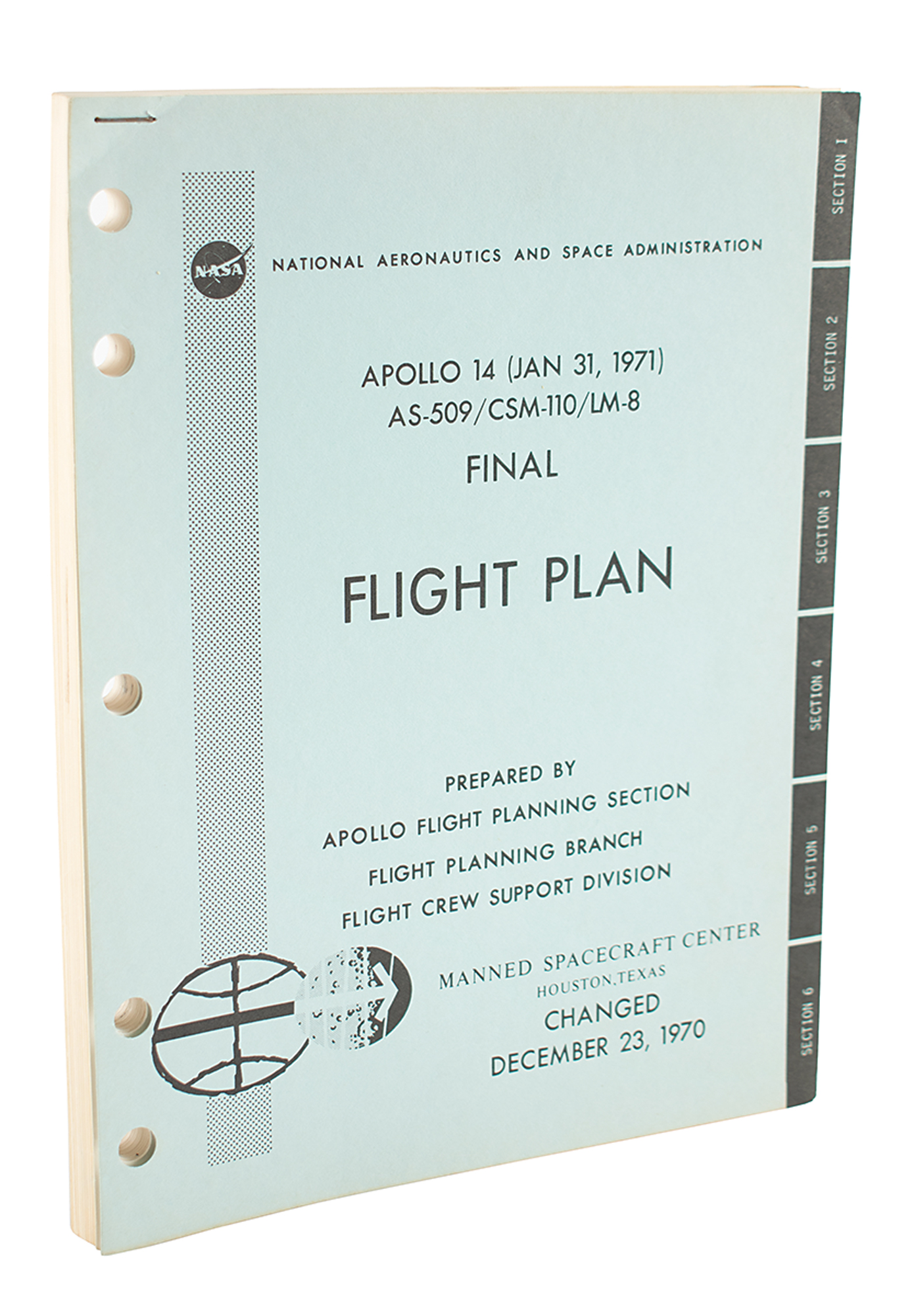 Staple-bound official NASA revision document for the Apollo 14 mission's flight plan, entitled “Apollo 14 (Jan 31, 1971), AS-509/CSM-110/LM-8, Final Flight Plan,” prepared by the Apollo Flight Planning Section at Houston's Manned Spacecraft Center, with a change date of December 23, 1970, 8 x 10.5, approximately 130 pages. The document provides changes to the flight plan's timeline, with details pertaining to the CSM and LM flight plans, photography sequences, and astronaut activities, as well as charts indicating propellant profiles for the mission. In fine condition.