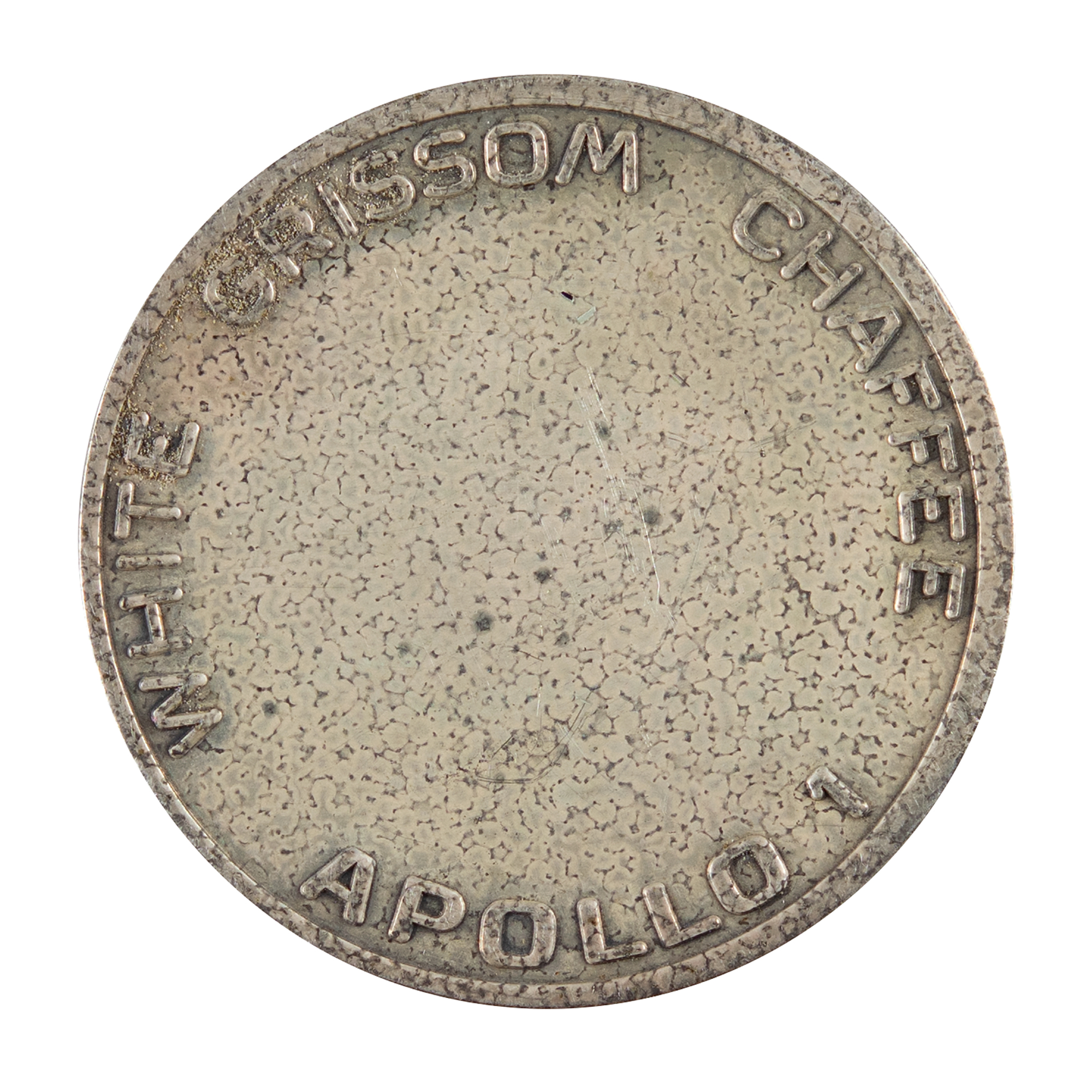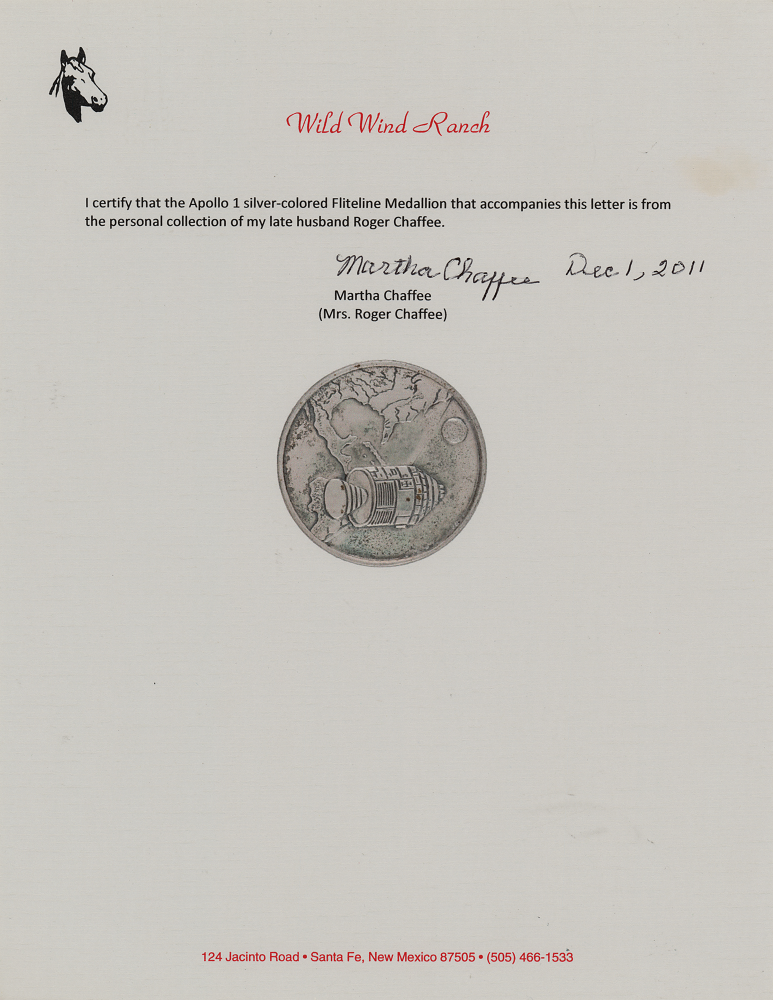Roger Chafee's silver-colored Apollo 1 Fliteline medallion, measuring 1.25″ diameter, commemorating the Apollo 1 mission. The front features a raised design of the mission insignia and the reverse boasts the last names of astronauts Gus Grissom, Ed White, and Roger Chaffee as well as "Apollo 1." Condition is mint state, with light overall tarnishing. Includes the original Fliteline case. Accompanied by a letter of authenticity signed by Chaffee's widow, Martha Chafee, in full: "I certify that the Apollo 1 silver-colored Fliteline Medallion that accompanies this letter is from the personal collection of my late husband Roger Chaffee."