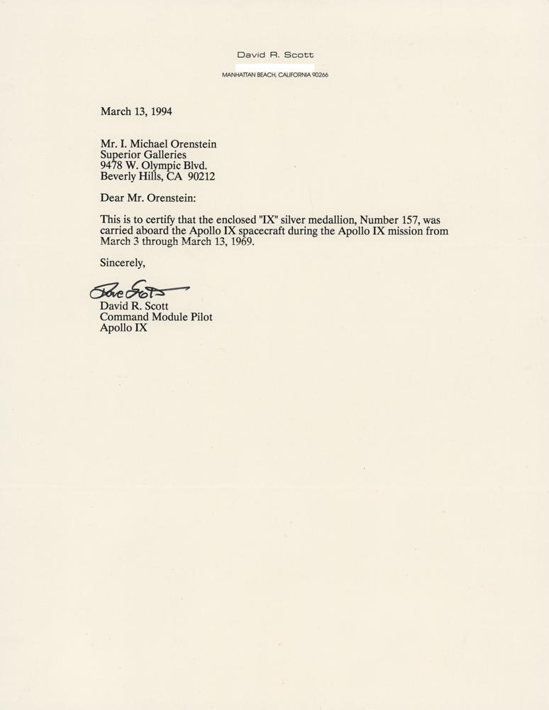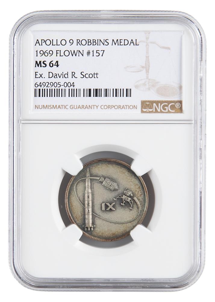 Flown sterling silver Apollo 9 Robbins medallion, approximately 1″ in diameter, with a raised design of the mission insignia on the face—the orbiting CM and LM with Saturn V launch vehicle, and mission number "IX" at center. The reverse is engraved with the mission dates, "March 3-13, 1969," and encircled by the surnames of the astronauts in raised text: "McDivitt, Scott, Schweickart." The medal is serial numbered "157" and stamped below with the Robbins "Sterling" hallmark. Encapsulated and graded by NGC as "MS 64," with the label noting the provenance, "Ex. David R. Scott." Accompanied by its original case and a letter of provenance signed by Apollo 9 CMP Dave Scott, in full: "This is to certify that the enclosed 'IX' silver medallion, Number 157, was carried aboard the Apollo IX spacecraft during the Apollo IX mission from March 3 through March 13, 1969."