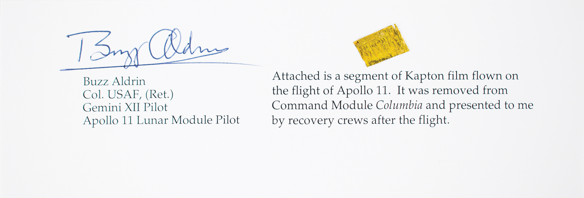 Small swatch of flown Kapton foil removed from the Apollo 11 CM 'Columbia,' measuring approximately .75″ x .5″, affixed to an 8″ x 3″ sheet with a typed certification statement signed in blue ballpoint by the Apollo 11 LMP, "Buzz Aldrin." In full: "Attached is a segment of Kapton film flown on the flight of Apollo 11. It was removed from Command Module Columbia and presented to me by recovery crews after the flight." In fine condition. The Apollo 11 Command Module's Kapton foil experienced the searing heat of re-entry into Earth's atmosphere on July 24, 1969, and much of it burned off; what little remained has long since been prized as a flight-flown souvenir.
