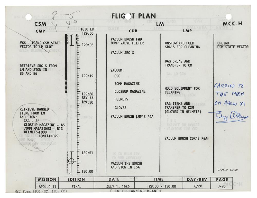 Sought-after flown 10.5 x 8 double-sided page from the final Apollo 11 Flight Plan carried into lunar orbit aboard the Command Module 'Columbia' during the first lunar landing mission, signed and flight-certified on both sides in blue ballpoint, “Carried to the moon on Apollo XI, Buzz Aldrin.” The page also bears a couple in-flight pencil notations by Apollo 11 CMP Michael Collins. The page's front and back, numbered "3-95" and "3-96," document the schedule for a two-hour span following the successful moonwalking mission, after their liftoff from the lunar surface and docking with the Command Module 'Columbia.' The pages describes several cleaning procedures—the astronauts and their gear were still covered in lunar dust—as well as preparations for jettison of the Lunar Module Eagle's Ascent Stage as they readied the spacecraft for its voyage back to Earth. In fine condition.