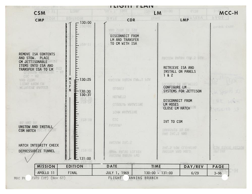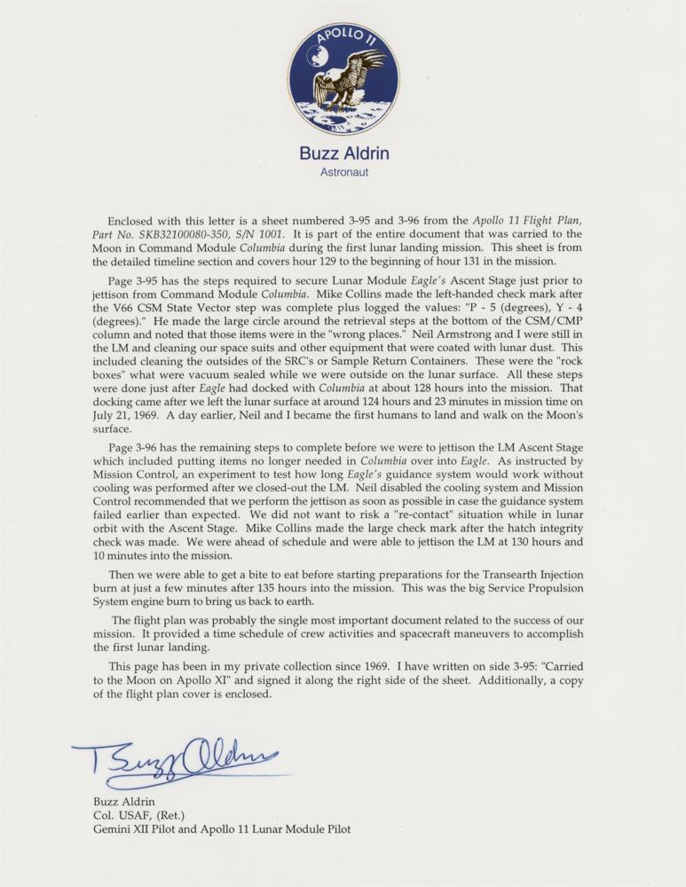 Accompanied by a detailed letter of provenance signed by Buzz Aldrin, in part: "Enclosed with this letter is a sheet numbered 3-95 and 3-96 from the Apollo 11 Flight Plan, Part No. SKB32100080-350, S/N 1001. It is part of the entire document that was carried to the moon in Command Module Columbia during the first lunar landing mission. This sheet is from the detailed time line section and covers hour 129 to the beginning of hour 131 in the mission.
