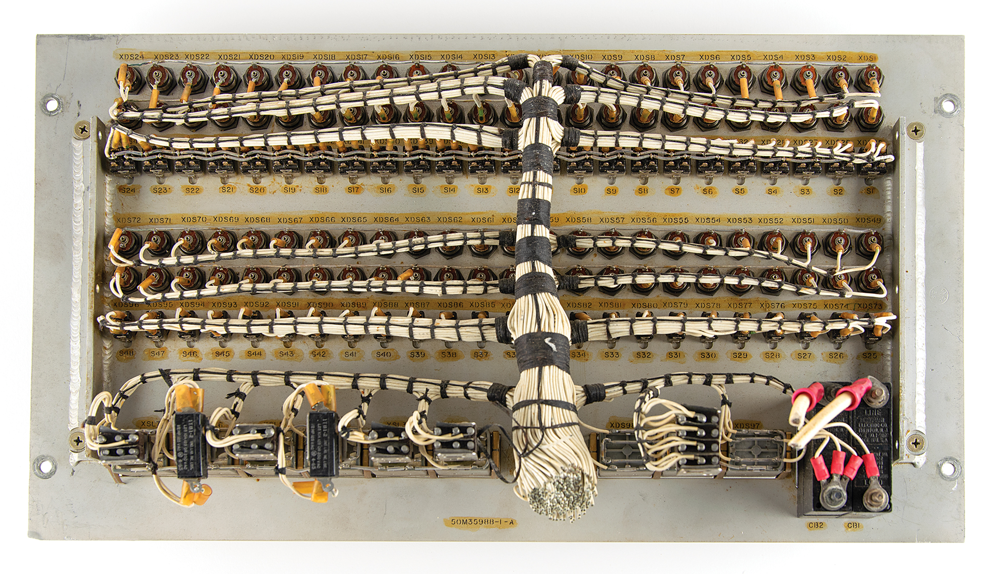 Rack-mountable Discrete Output Control panel from Kennedy Space Center, measuring 19″ x 10.5″x 4″, labeled at the bottom, "Discrete Output Control," with four rows of 23 numbered indicators, 46 small switches, and nine control buttons along the bottom. The banks of buttons are identified as "Address Word: Reply / Command," "Data Word: Reply / Command," "Power," and "Controls." A NASA property sticker is affixed to lower left corner of the panel, and the intricate wiring remains intact on the reverse. In fine condition, with one button cover missing and overall wear.