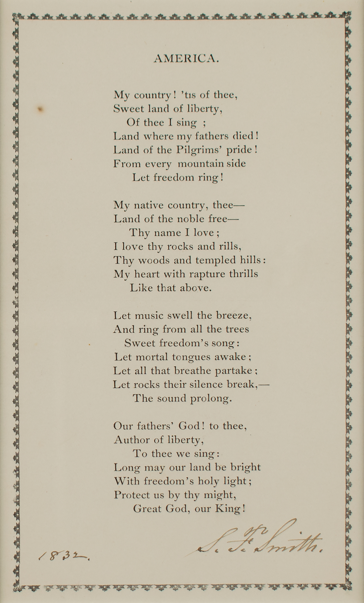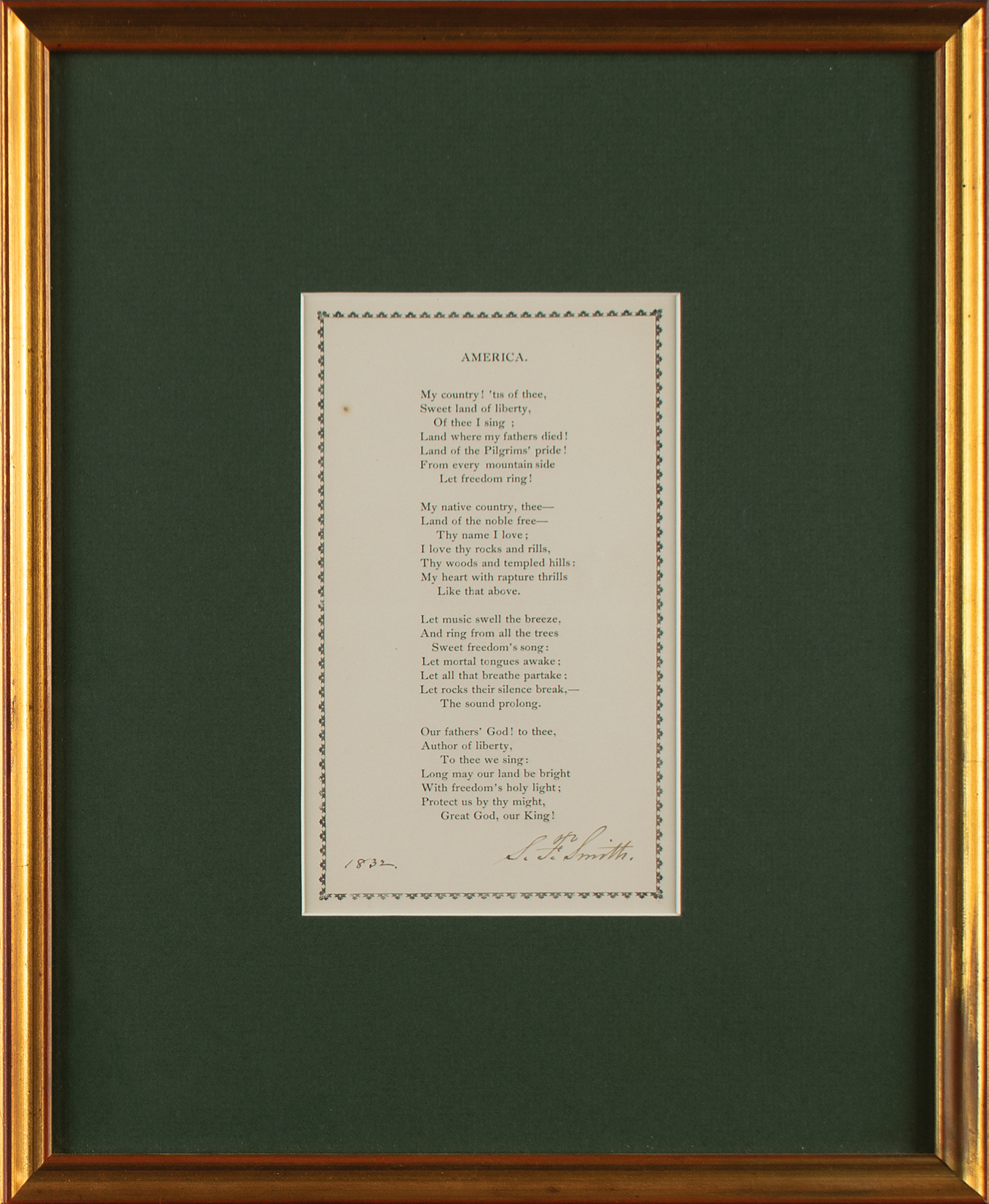 Boston-born Baptist minister and academic (1808-1895) best known as the lyricist of 'America' ('My Country, 'Tis of Thee'), written while he was a student at Andover Theological Seminary. Uncommonly early broadside of Samuel Francis Smith’s 1831 patriotic song ‘America’ ('My Country, 'Tis of Thee'), 4.25 x 7.25, signed below in fountain pen, “S. F. Smith, 1832.” The song, in part: “My country! 'tis of thee, / Sweet land of liberty, / Of thee I sing; / Land where my fathers died! / Land of the Pilgrims' pride! / From every mountain side / Let freedom ring!" Handsomely matted and framed to an overall size of 11.5 x 14. In fine condition.